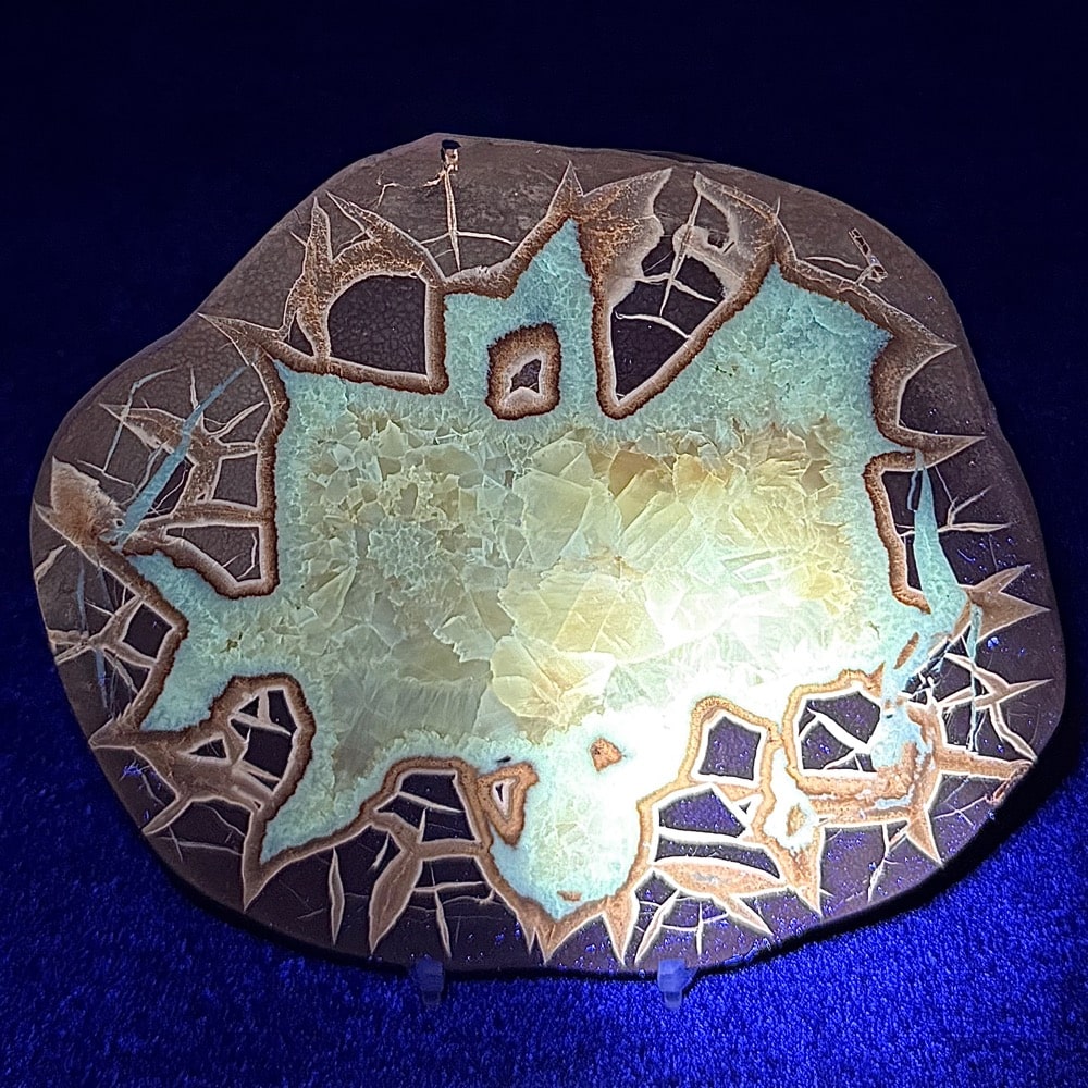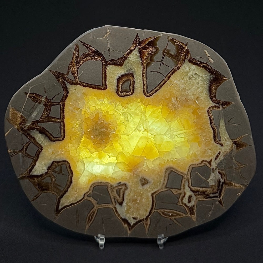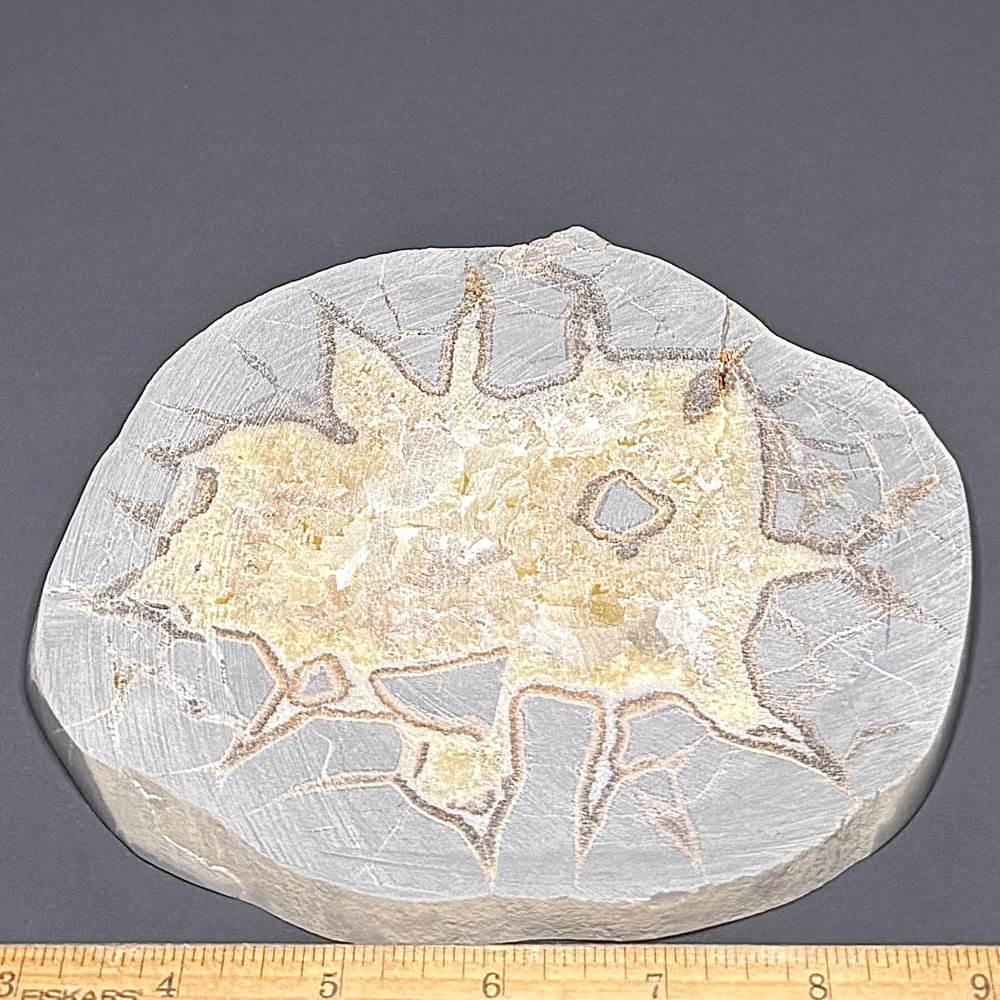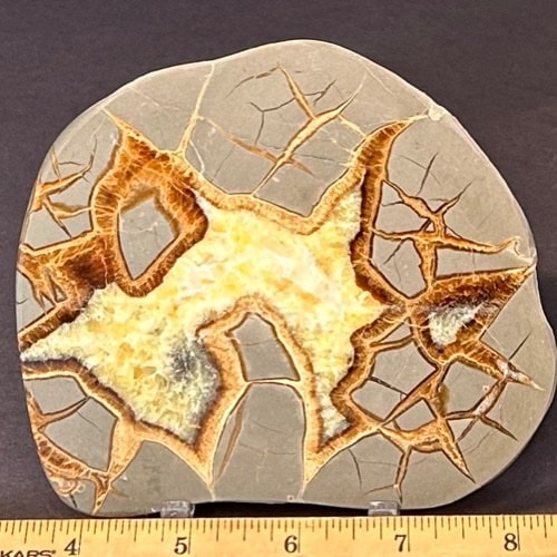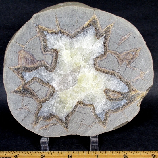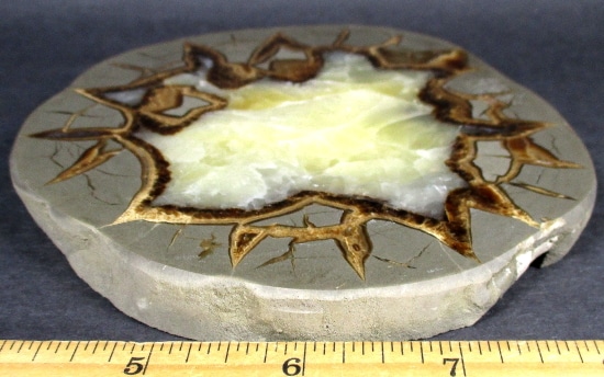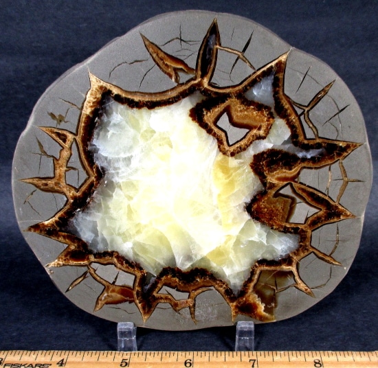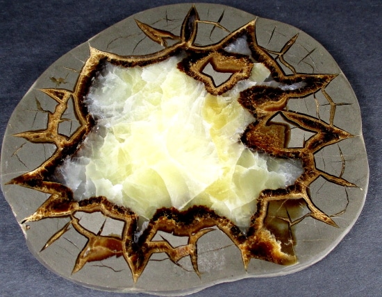 Septarian, also known as a type of Concretion, is a volume of sedimentary rock in which a mineral cement fills the porosity. Concretions are often ovoid or spherical in shape. They form within layers of sedimentary strata that has already been deposited. It is composed of a Carbonate mineral such as Calcite, a Silica such as Chert, Flint or Jasper or an Iron Oxide such as Goethite or Hematite. It is commonly found in Shale, Siltstones and Sandstones.