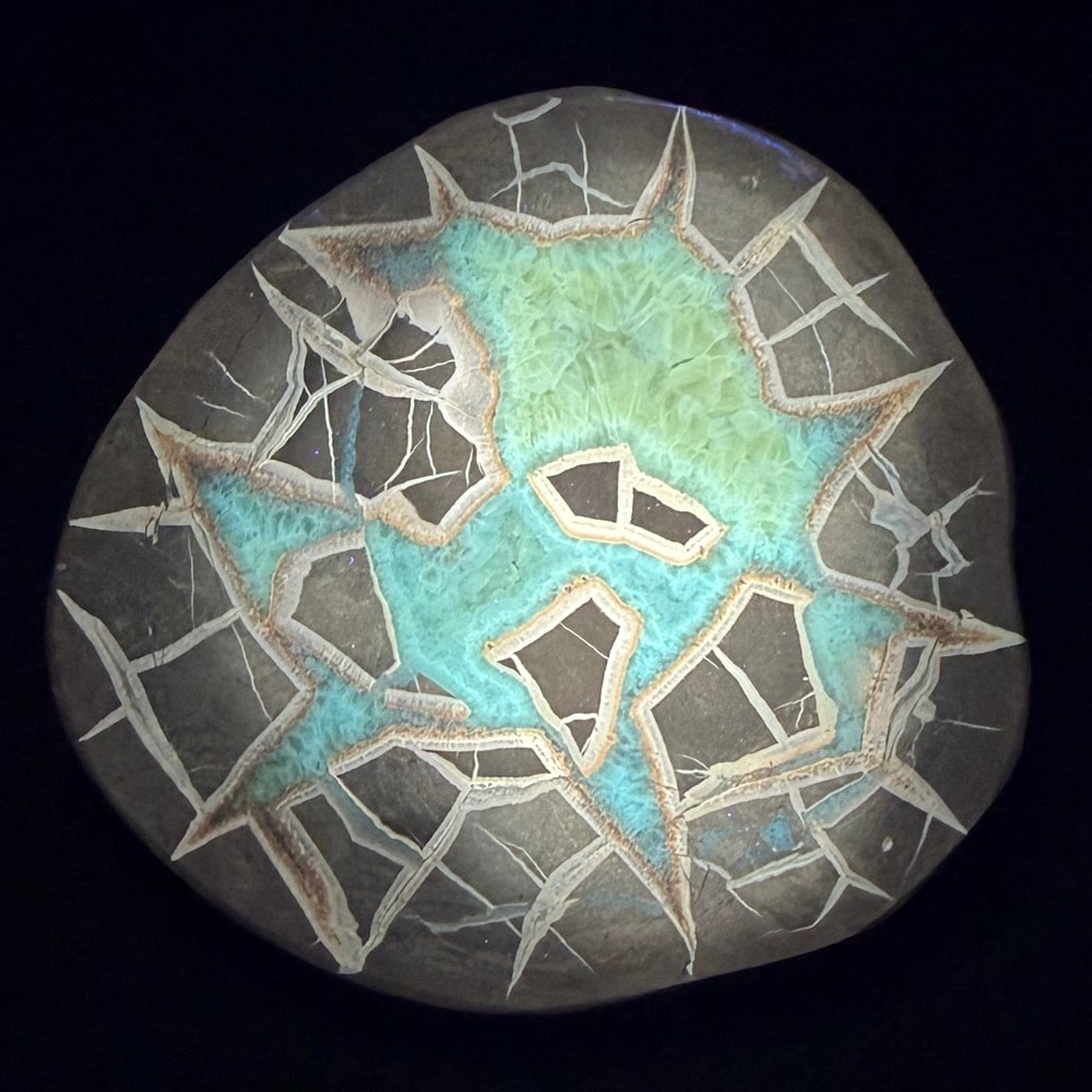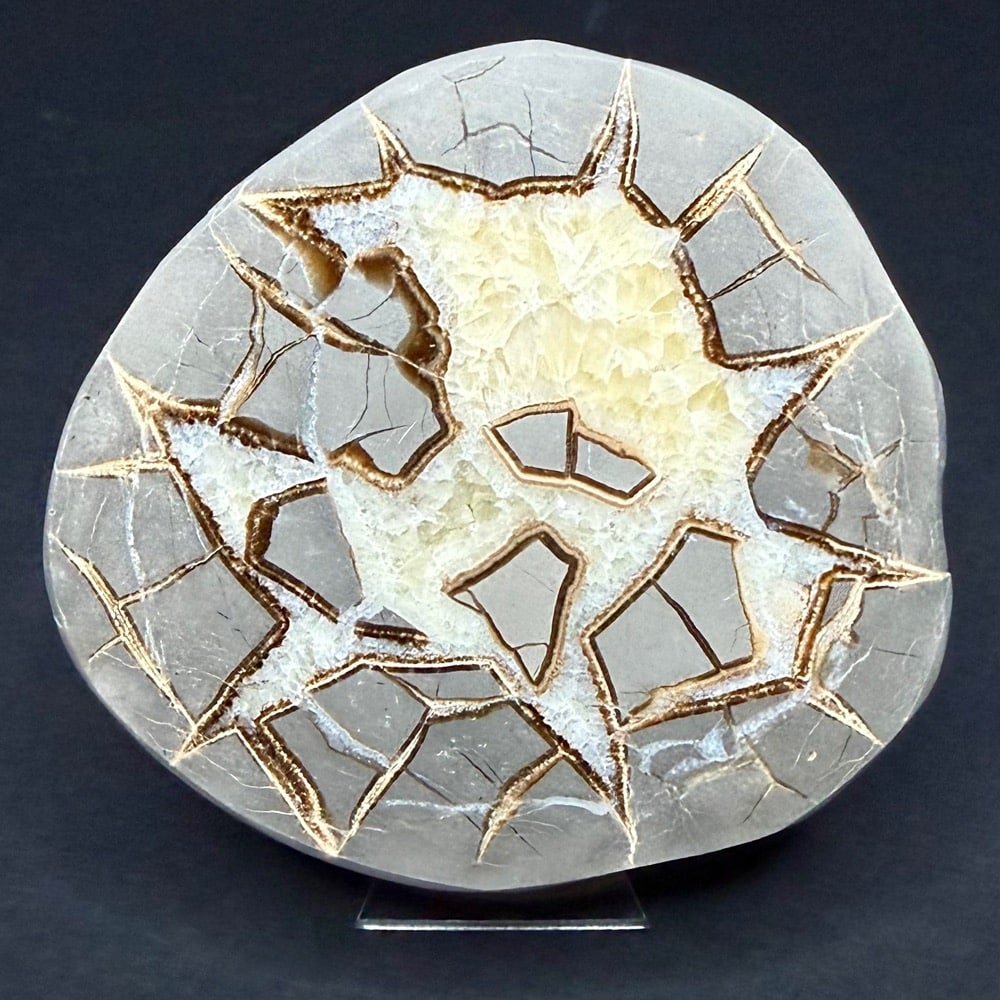 Septarian, also known as a type of Concretion, is a volume of sedimentary rock in which a mineral cement fills the porosity. Concretions are often ovoid or spherical in shape. They form within layers of sedimentary strata that has already been deposited. It is composed of a Carbonate mineral such as Calcite, a Silica such as Chert, Flint or Jasper or an Iron Oxide such as Goethite or Hematite. It is commonly found in Shale, Siltstones and Sandstones.