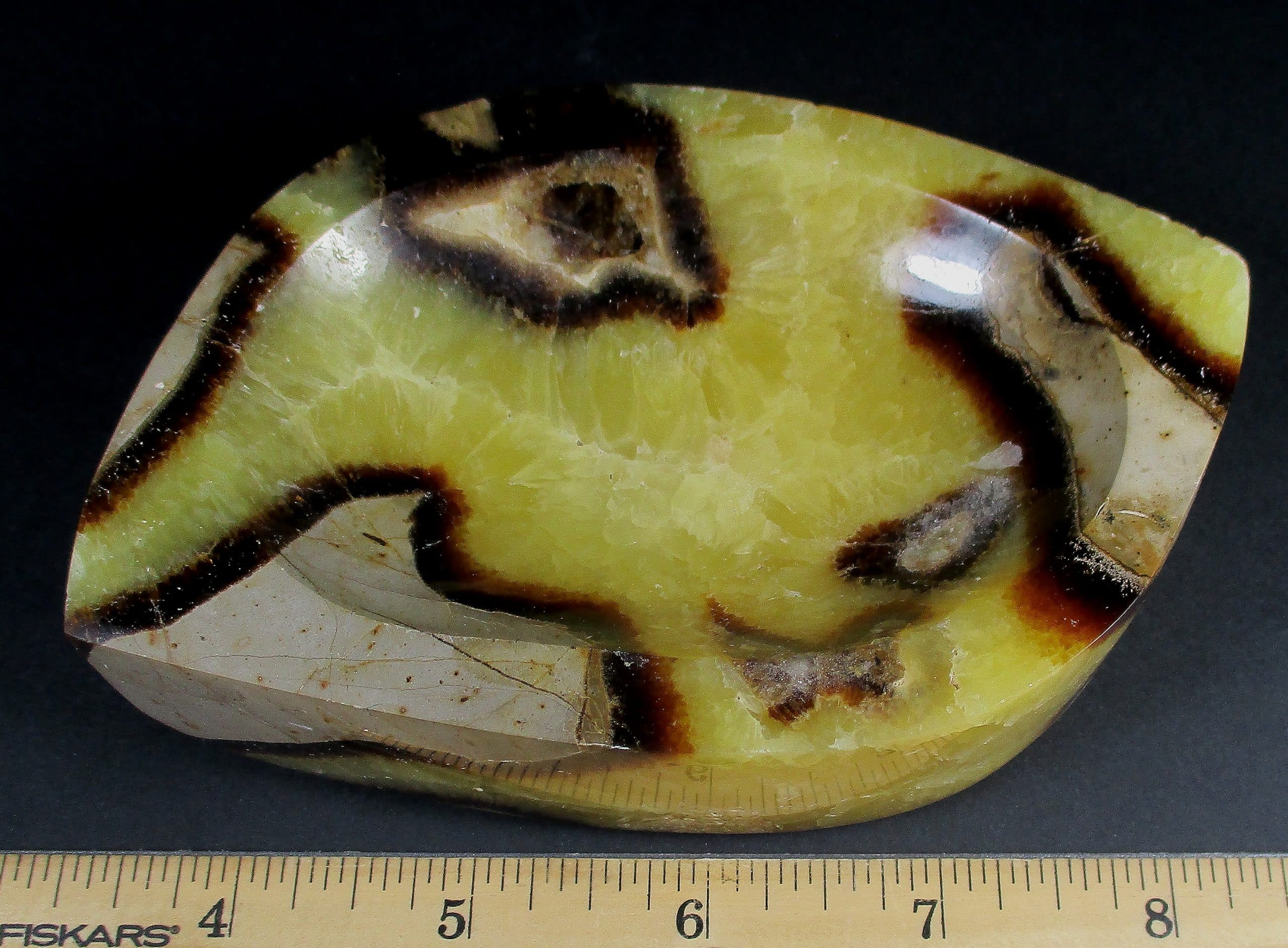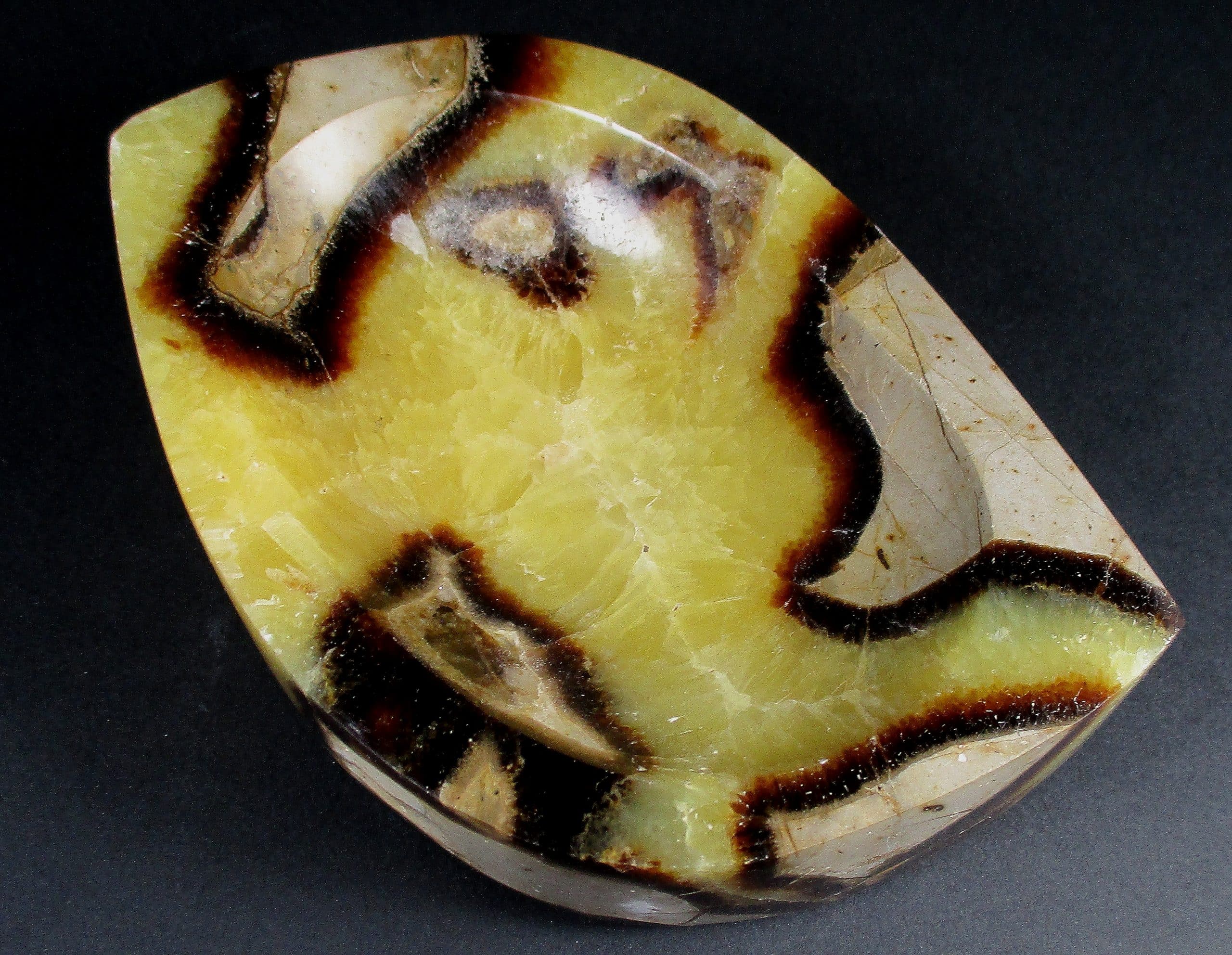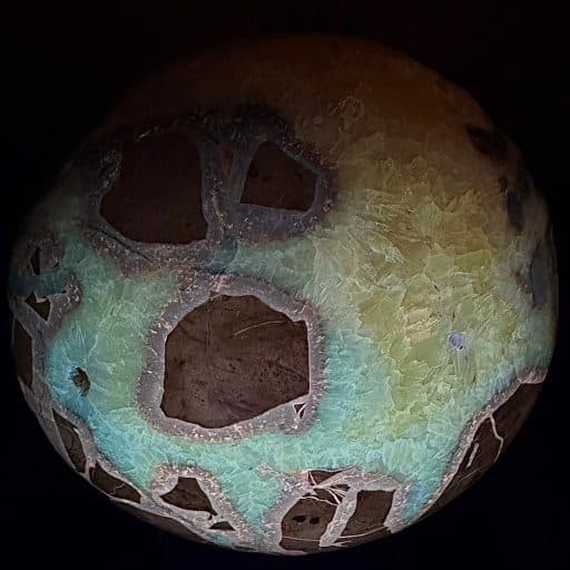 Appearance: Mineral Content – Yellow Calcite and Brown Aragonite. Cut and polished, from host Concreation. UV Fluorescent.