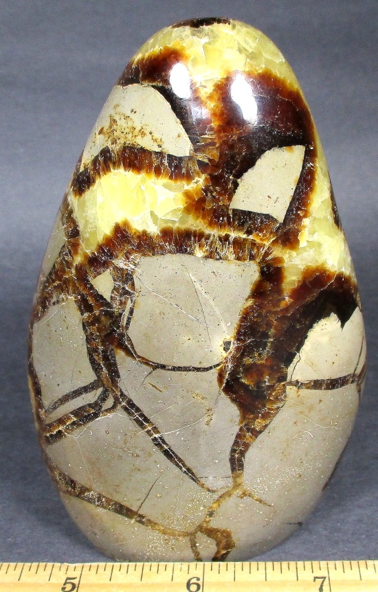 Septarian, also known as a type of Concretion, is a volume of sedimentary rock in which a mineral cement fills the porosity.  Concretions are often ovoid or spherical in shape.  They form within layers of sedimentary strata that has already been deposited.  It is composed of a Carbonate mineral such as Calcite, a Silica such as Chert, Flint or Jasper or an Iron Oxide such as Goethite or Hematite.  It is commonly found in Shale, Siltstones and Sandstones.
