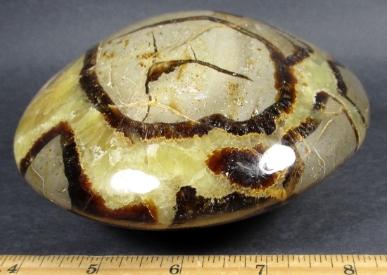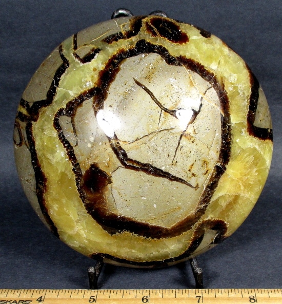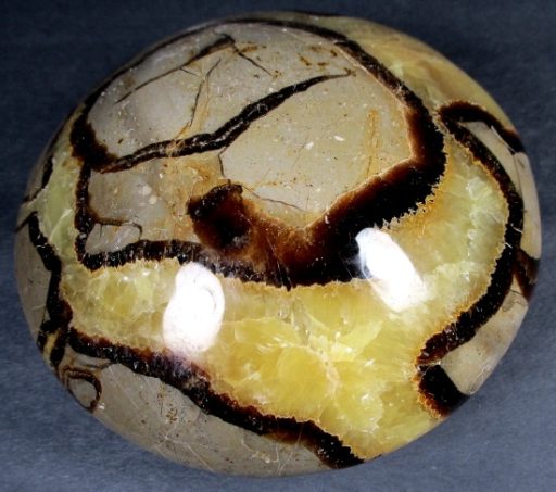 Septarians are commonly composed of a carbonate mineral such as Calcite, a microcrystalline form of Silica as in Flint or Jasper, or an Iron Oxide such as Hematite. These specimens are also known as a concretion which is a type of sedimentary rock. Septarians were formed millions of years ago by sediment forming around a fossil to create a mud ball transforming the fossil into Calcite and Aragonite.
