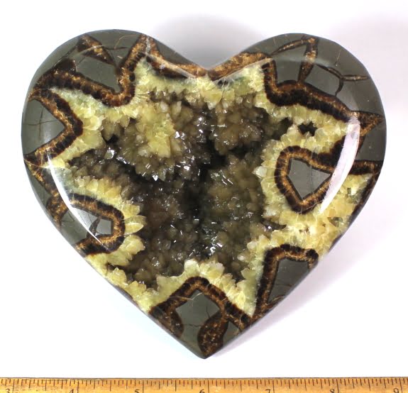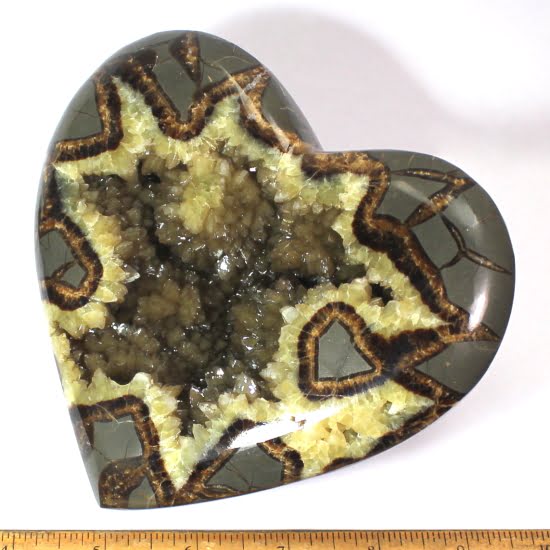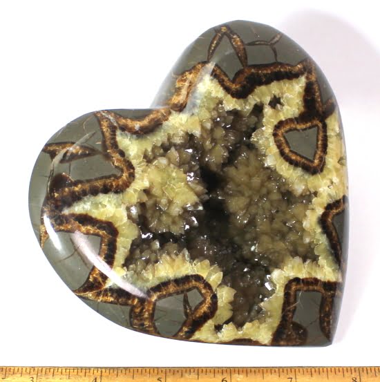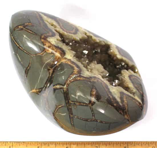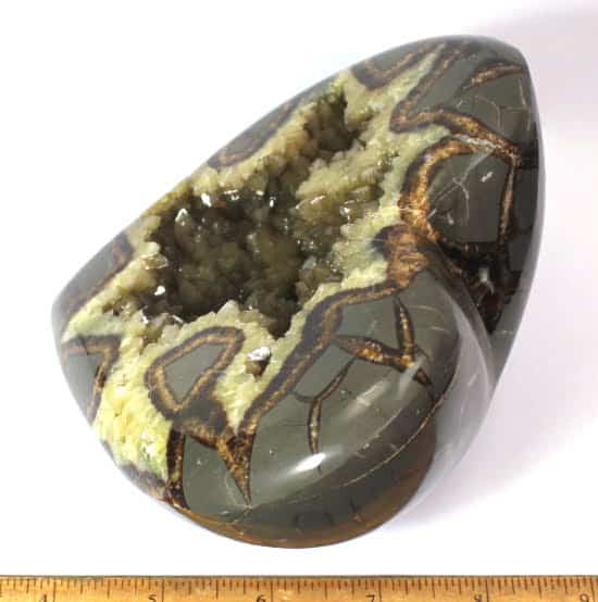 Septarians are commonly composed of a carbonate mineral such as Calcite, a microcrystalline form of Silica as in Flint or Jasper, or an Iron Oxide such as Hematite. These specimens are also known as a concretion which is a type of sedimentary rock. Septarians were formed millions of years ago by sediment forming around a fossil to create a mud ball transforming the fossil into Calcite and Aragonite.