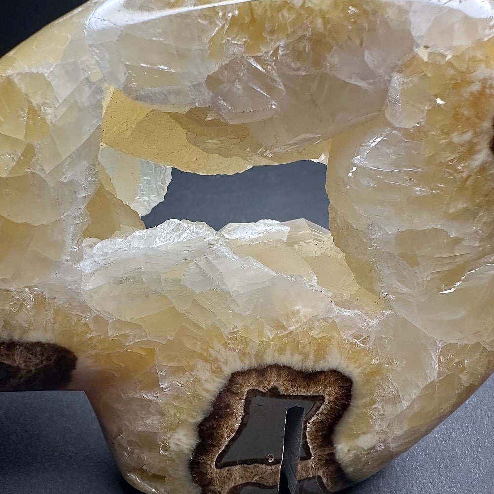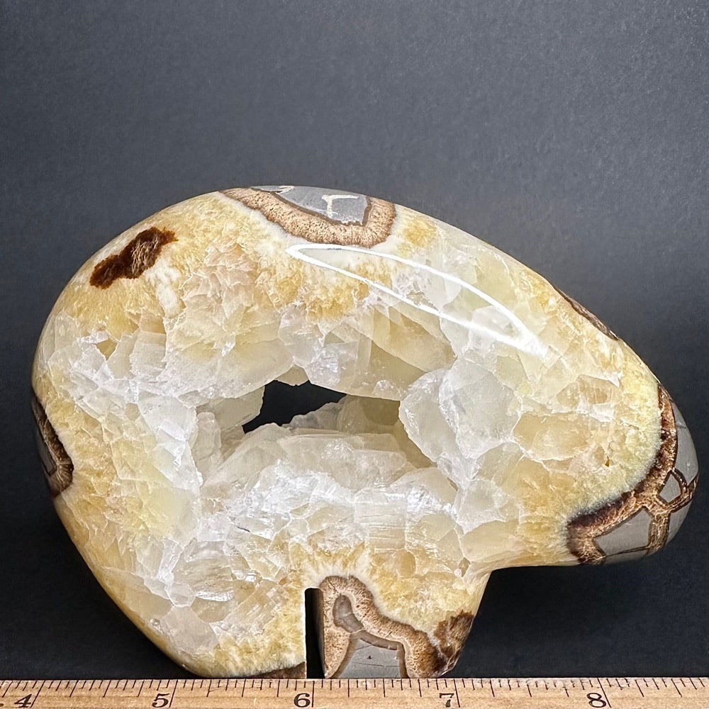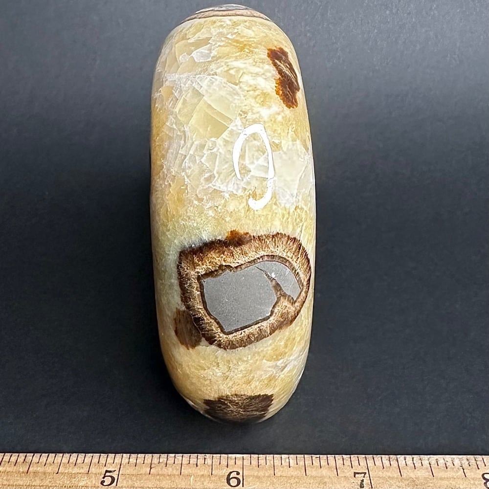 Septarian Concreations are commonly composed of a carbonate mineral such as Calcite, a microcrystalline form of Silica as in Flint or Jasper, or an Iron Oxide such as Hematite.  These specimens formed inside of a concretion, a type of sedimentary rock.   Septarian concretions were formed millions of years ago by sediment forming around a fossil to create a mud ball transforming the fossil into Calcite and Aragonite.