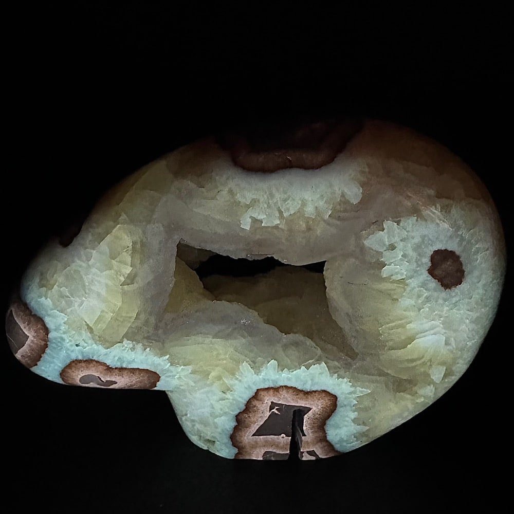 Appearance: Open cavity with calcite crystals. It also fluoresces under a SW/UV light.