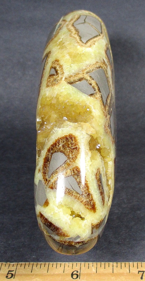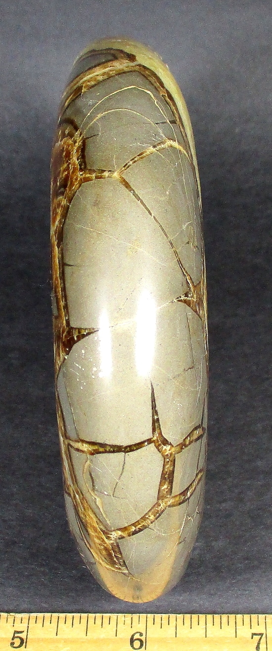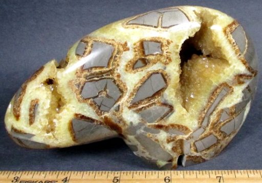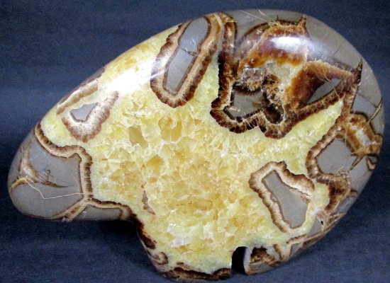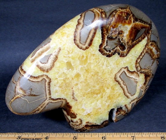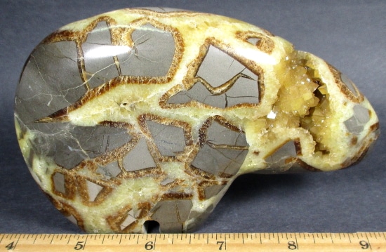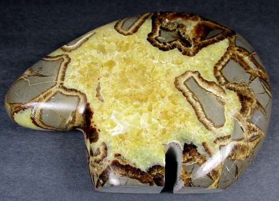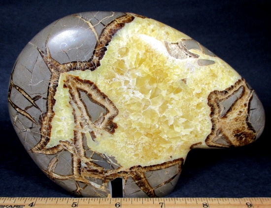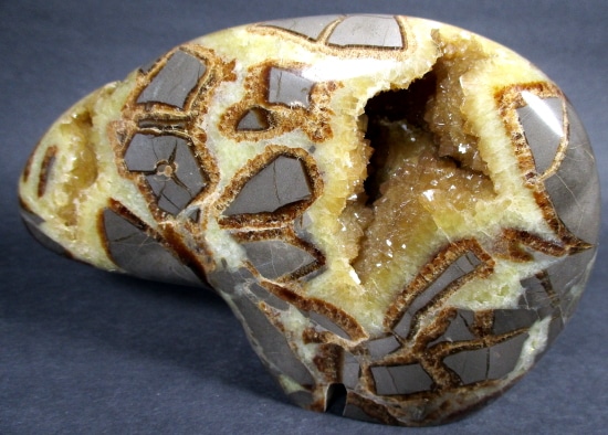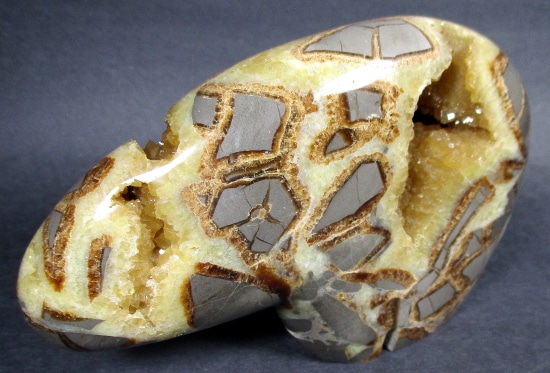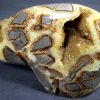 Septarians are commonly composed of a carbonate mineral such as Calcite, a microcrystalline form of Silica as in Flint or Jasper, or an Iron Oxide such as Hematite. These specimens are also known as a concretion which is a type of sedimentary rock. Septarians were formed millions of years ago by sediment forming around a fossil to create a mud ball transforming the fossil into Calcite and Aragonite.