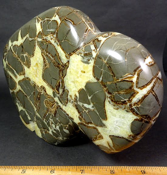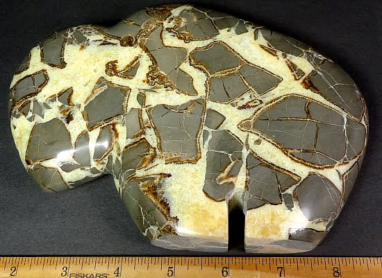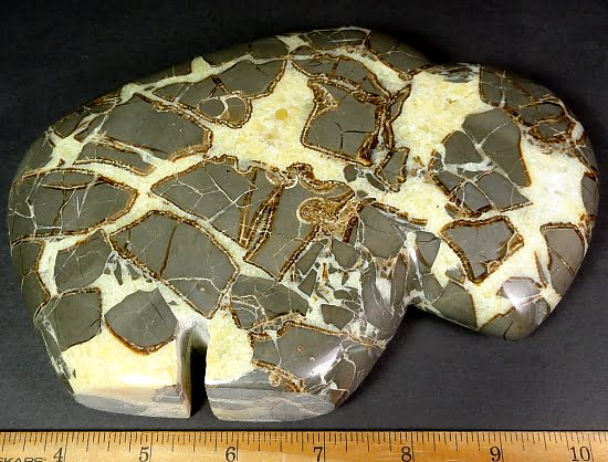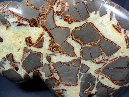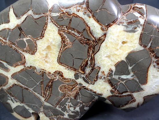 Septarian, also known as a type of Concretion, is a volume of sedimentary rock in which a mineral cement fills the porosity. Concretions are often ovoid or spherical in shape. They form within layers of sedimentary strata that has already been deposited. It is composed of a Carbonate mineral such as Calcite, a Silica such as Chert, Flint or Jasper or an Iron Oxide such as Goethite or Hematite. It is commonly found in Shale, Siltstones and Sandstones.