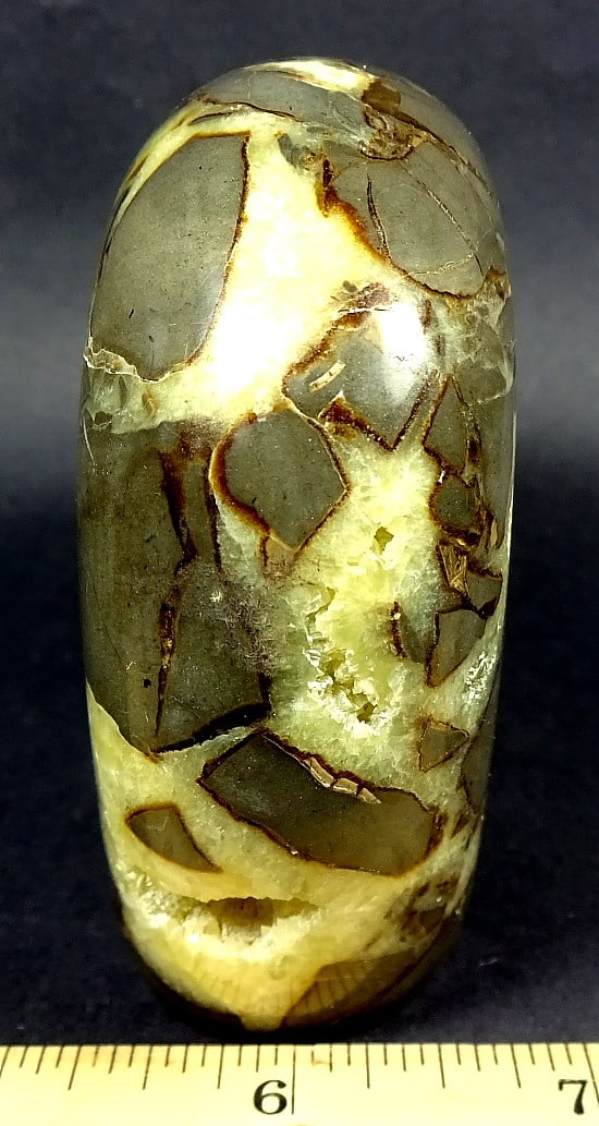 Appearance: Cut from Septarian Nodule. Concretion interior minerals – Calcite and Aragonite. Crustal cavities. UV Fluorescent.
