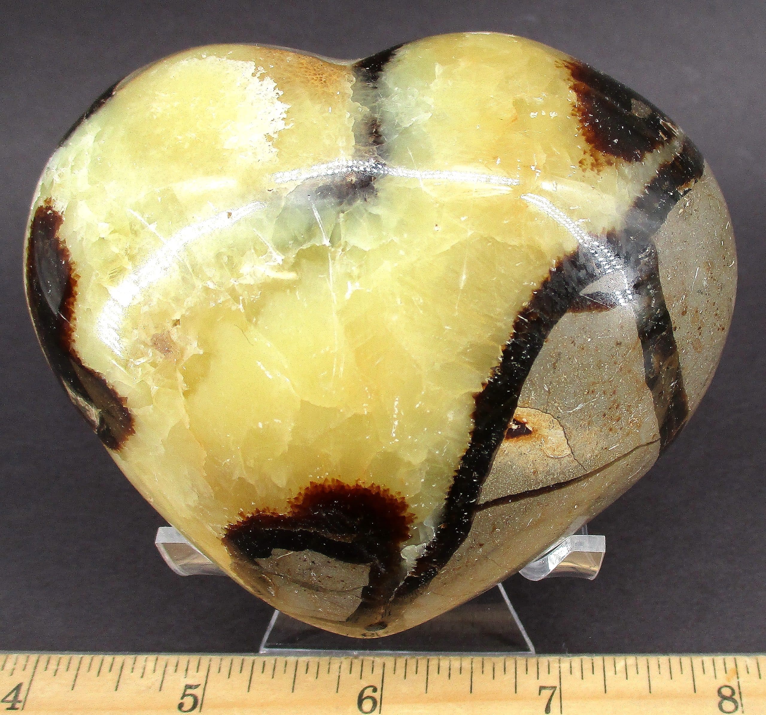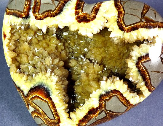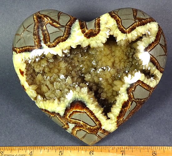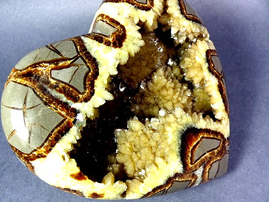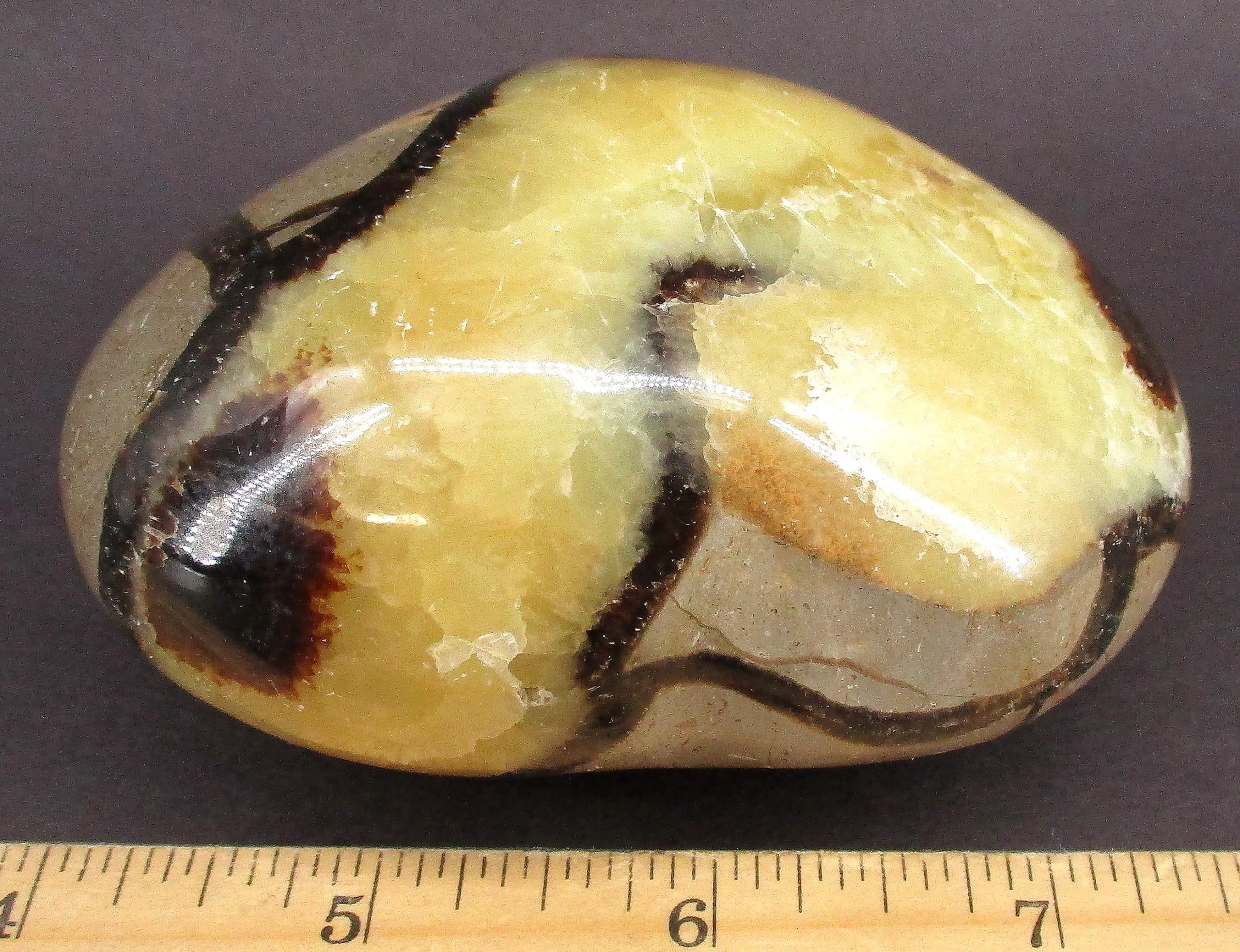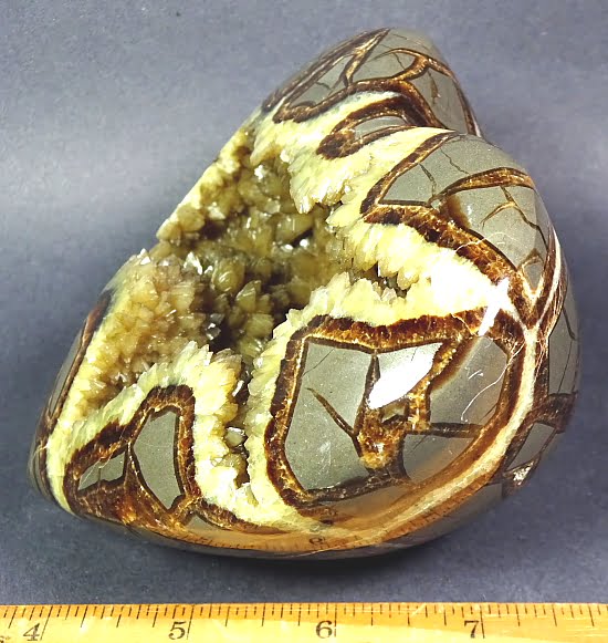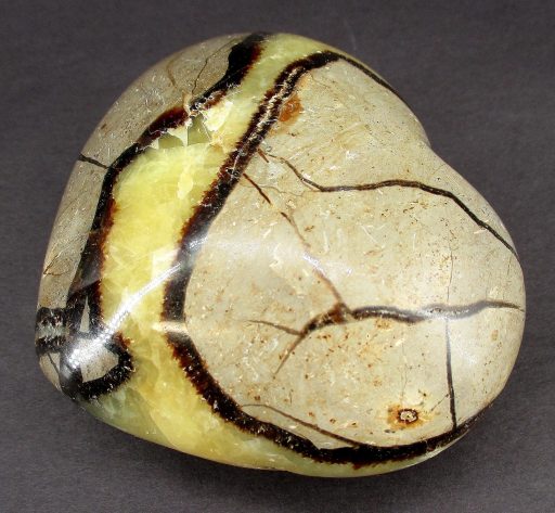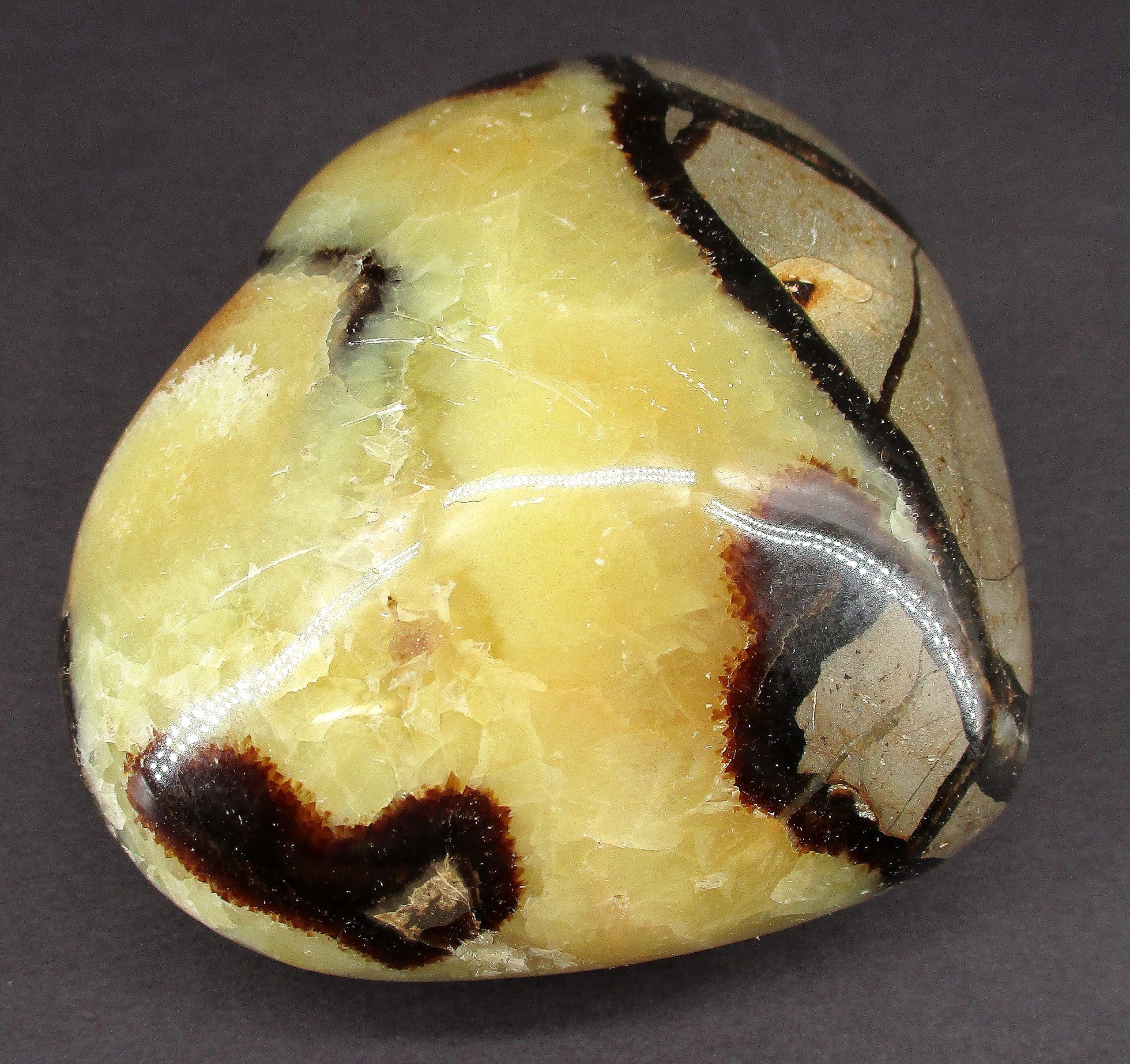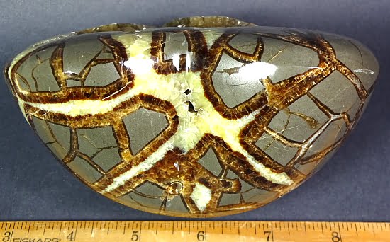 Septarian, also know as a type of Concretion, is a volume of sedimentary rock in which a mineral cement fills the porosity. Concretions are often ovoid or spherical in shape. They form within layers of sedimentary strata that has already been deposited. It is composed of a Carbonate mineral such as Calcite, a Silica such as Chert, Flint or Jasper or an Iron Oxide such as Goethite or Hematite. It is commonly found in Shale, Siltstones and Sandstones.