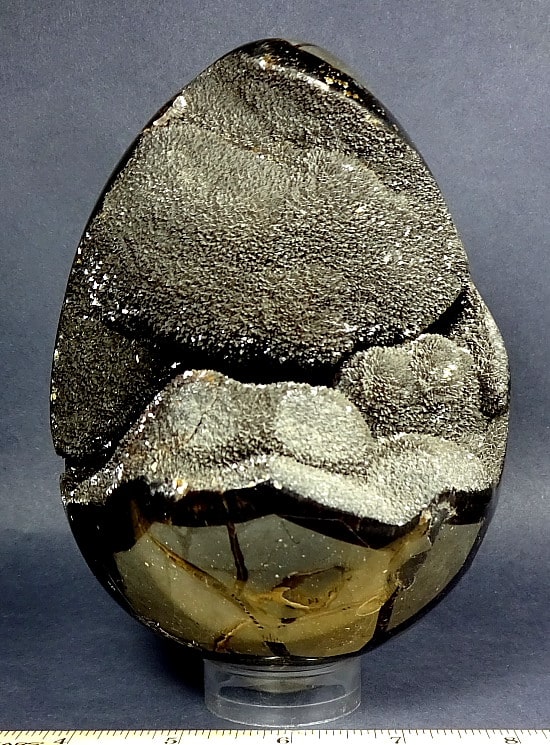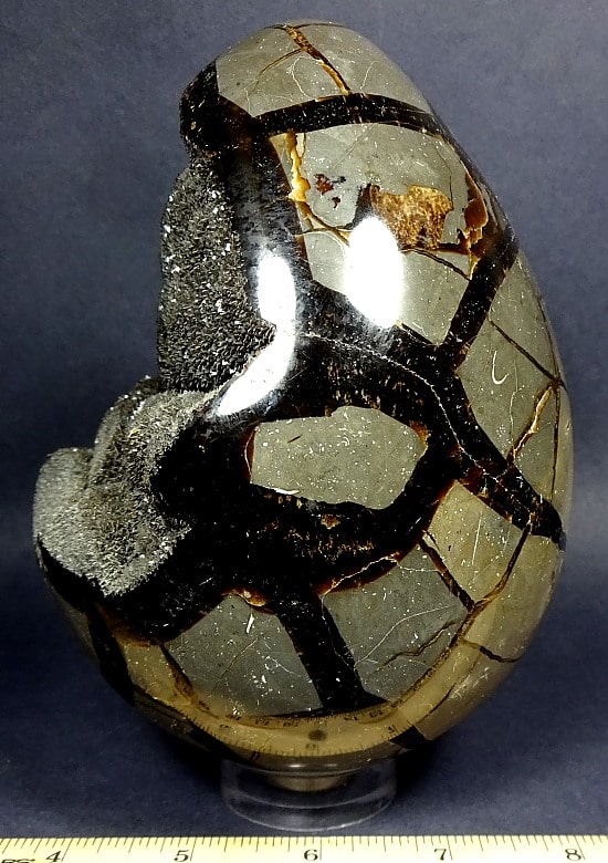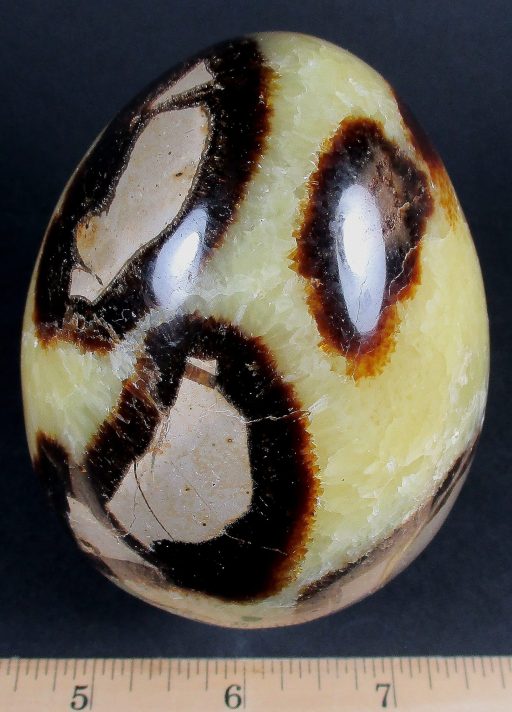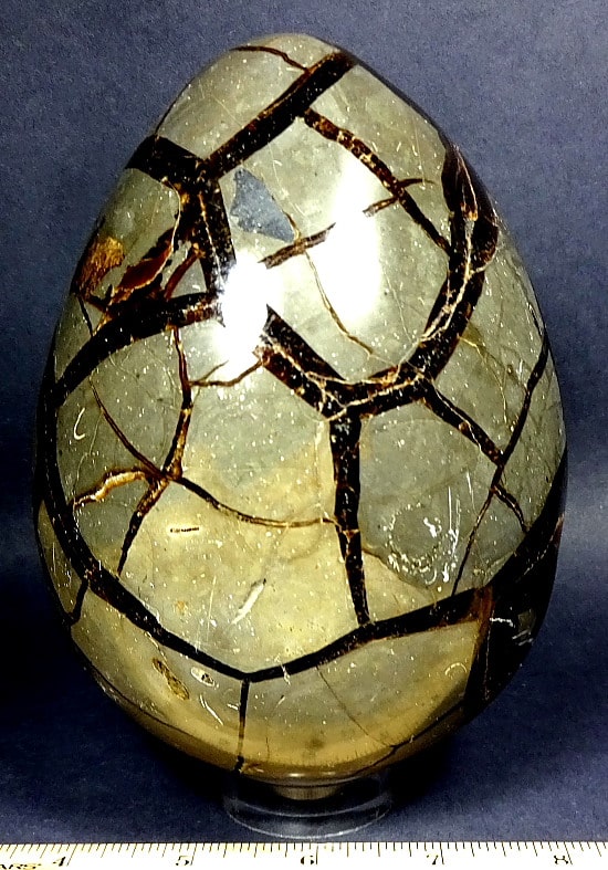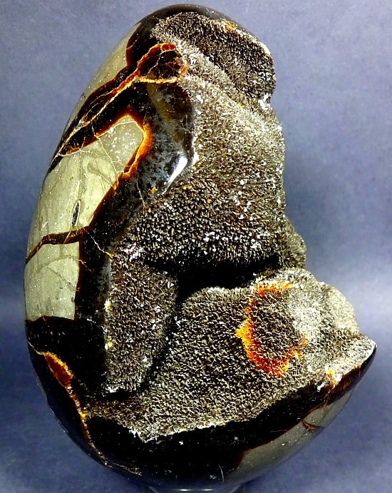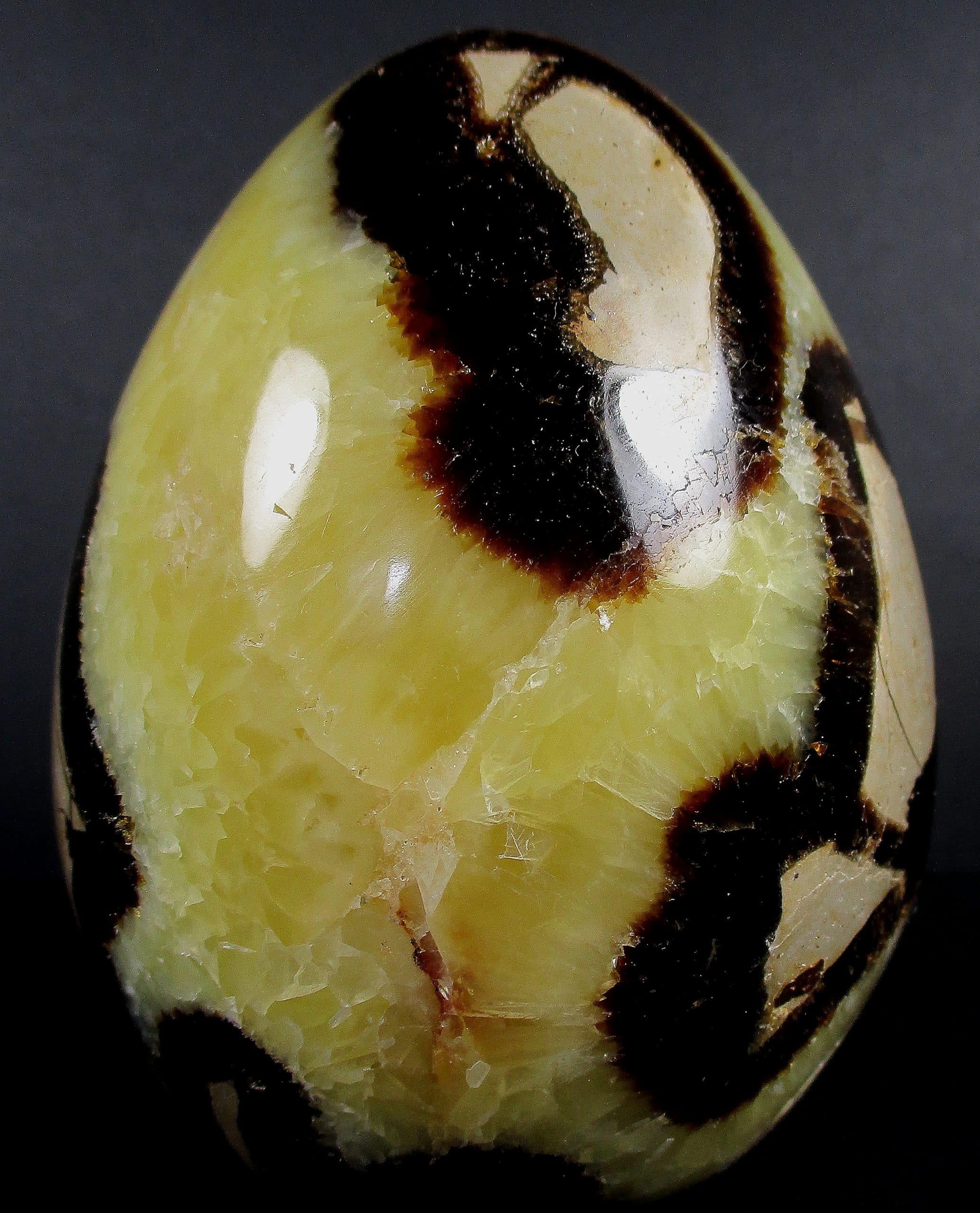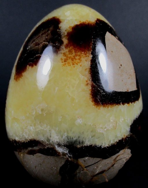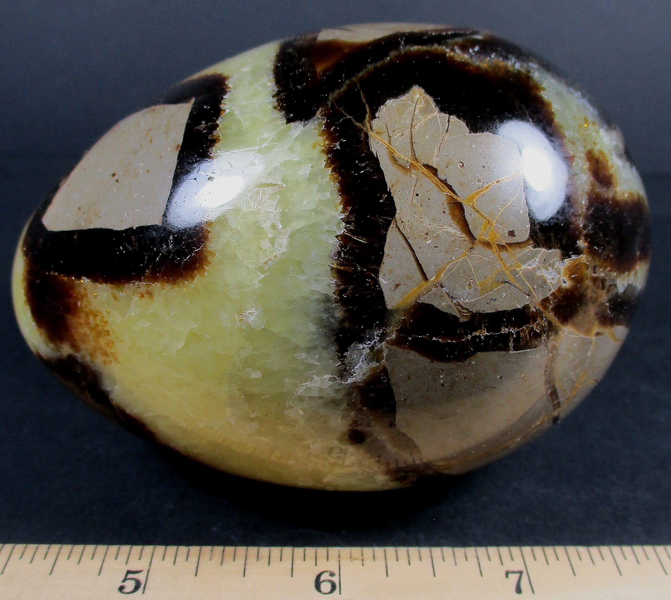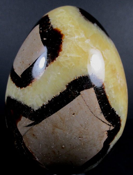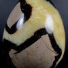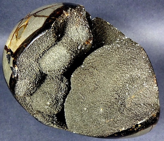 Septarian, also known as a type of Concretion, is a volume of sedimentary rock in which a mineral cement fills the porosity. Concretions are often ovoid or spherical in shape. They form within layers of sedimentary strata that has already been deposited. It is composed of a Carbonate mineral such as Calcite, a Silica such as Chert, Flint or Jasper or an Iron Oxide such as Goethite or Hematite. It is commonly found in Shale, Siltstones and Sandstones.