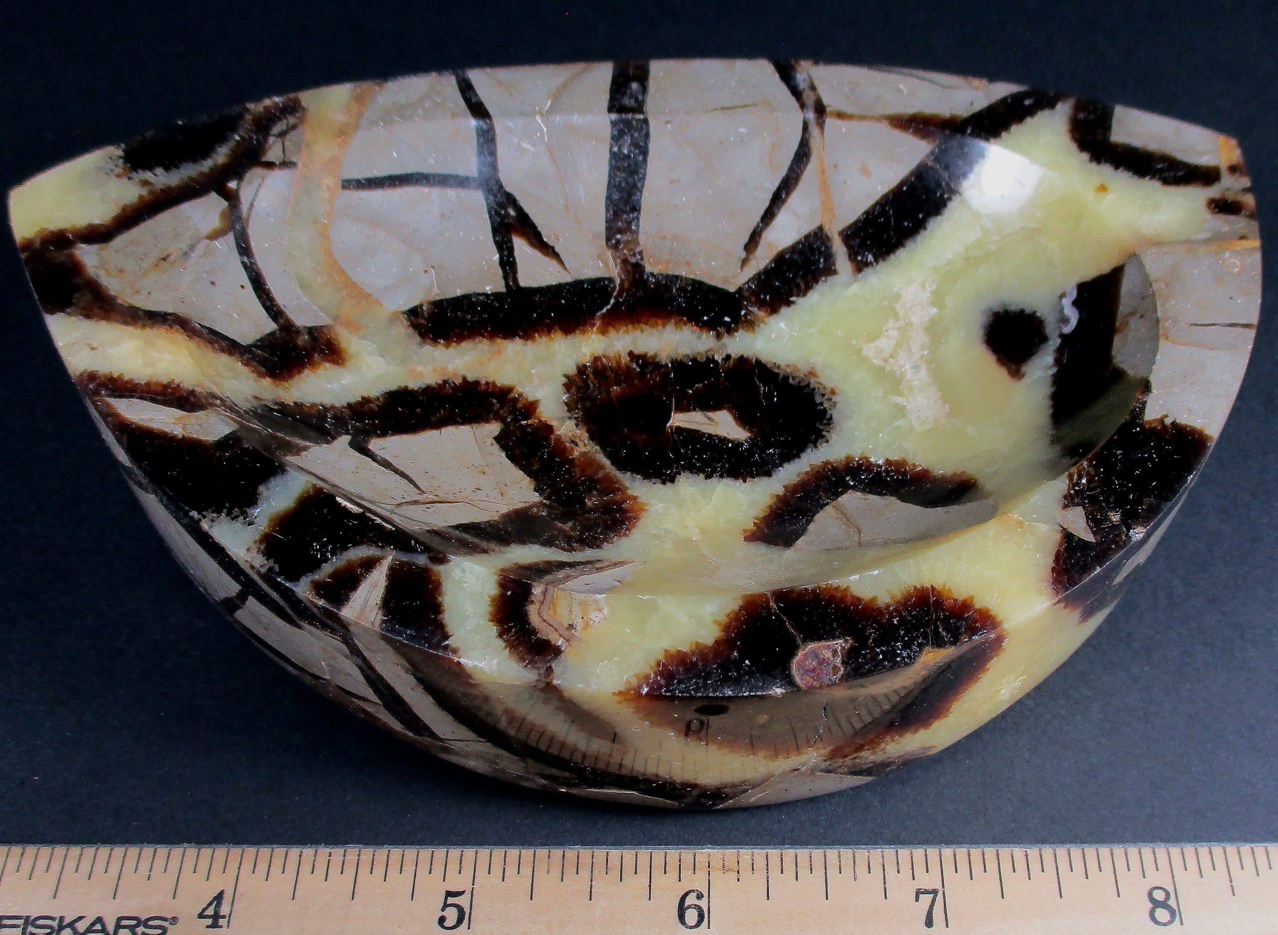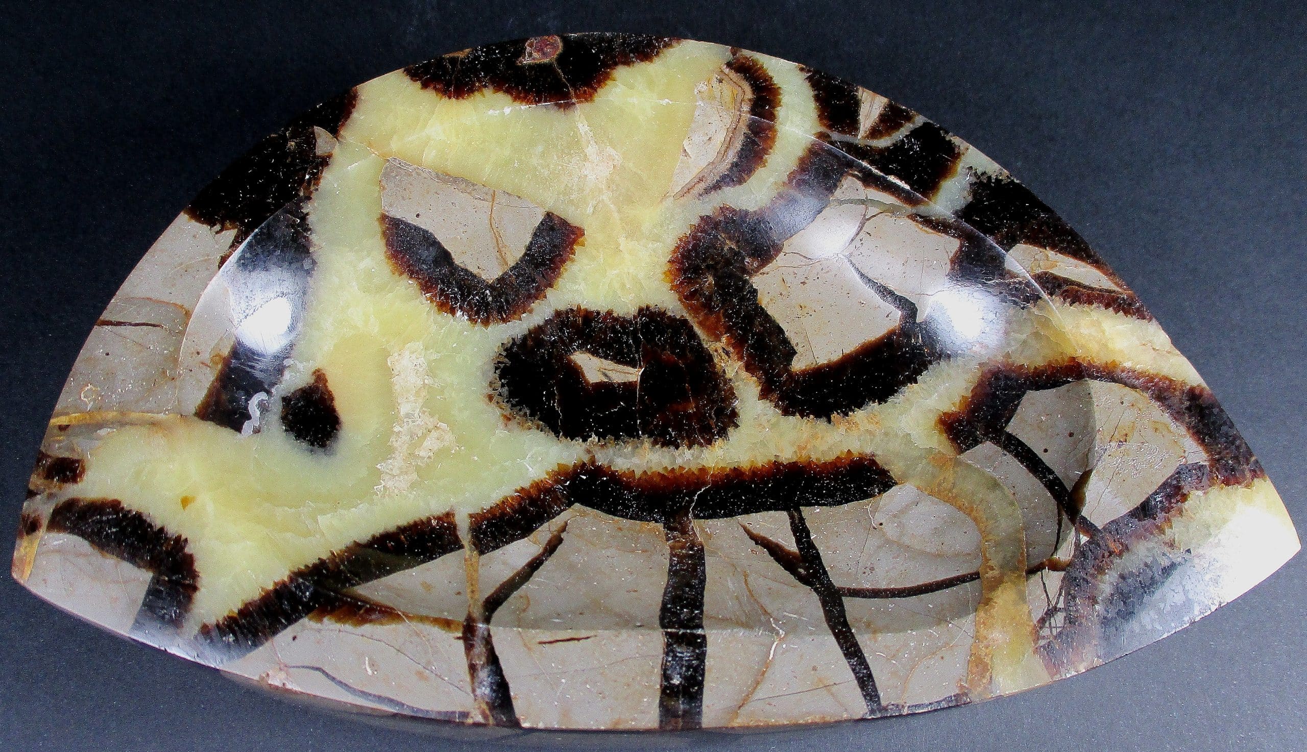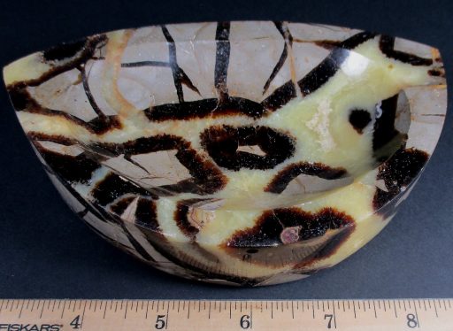 Septarian, also known as a type of Concretion, is a volume of sedimentary rock in which a mineral cement fills the porosity. Concretions are often ovoid or spherical in shape. They form within layers of sedimentary strata that has already been deposited. It is composed of a Carbonate mineral such as Calcite, a Silica such as Chert, Flint or Jasper or an Iron Oxide such as Goethite or Hematite. It is commonly found in Shale, Siltstones and Sandstones.