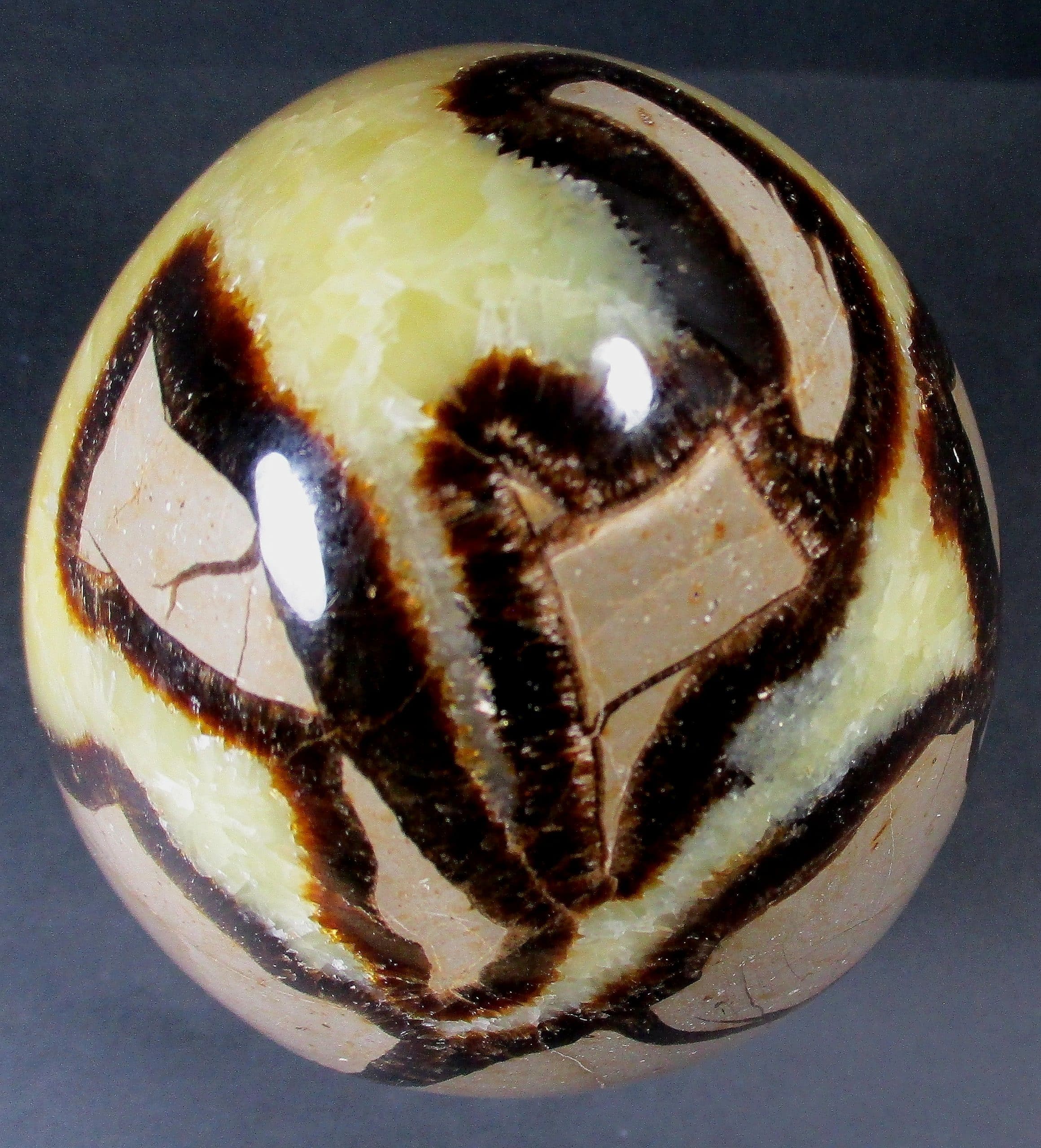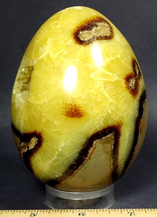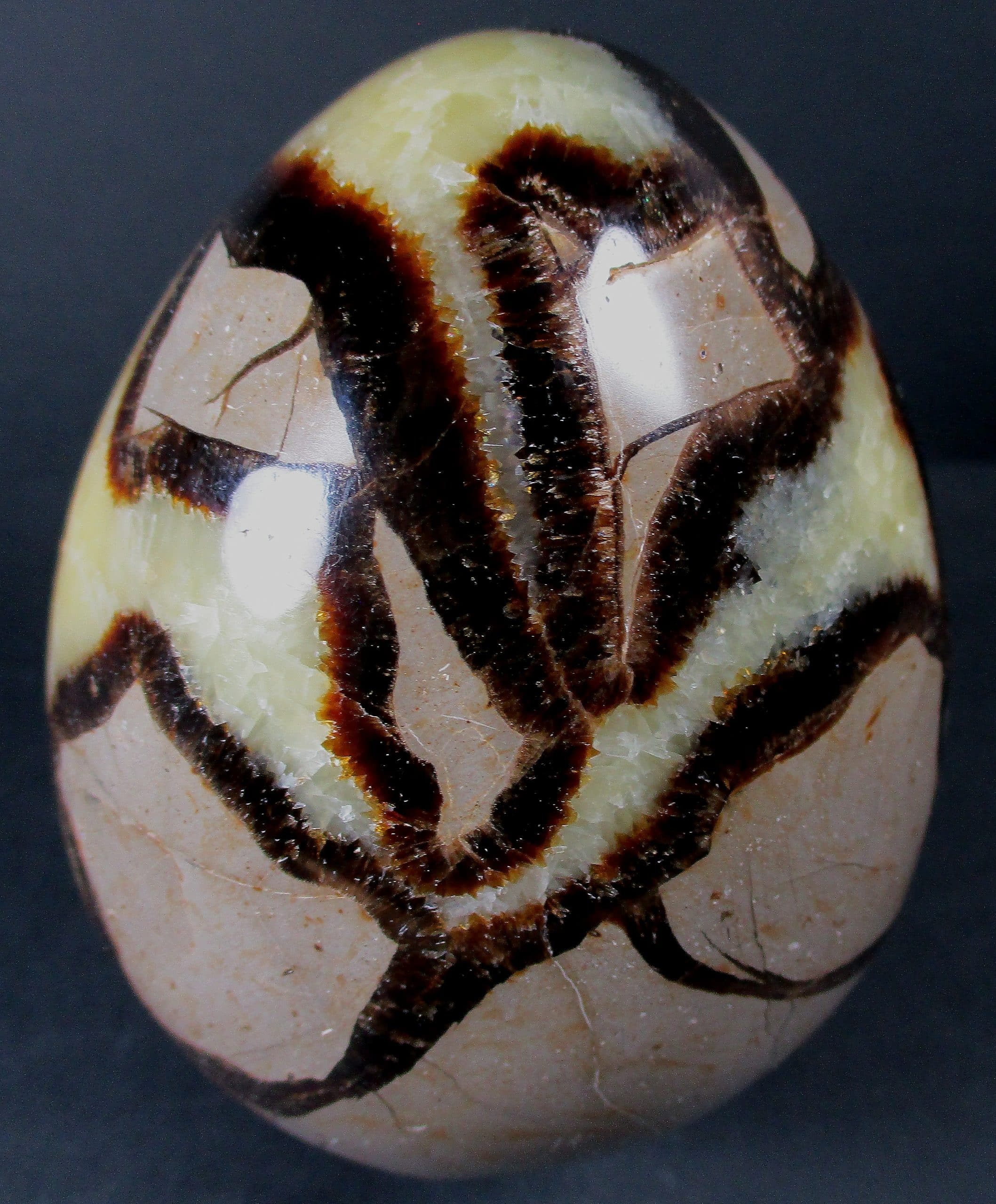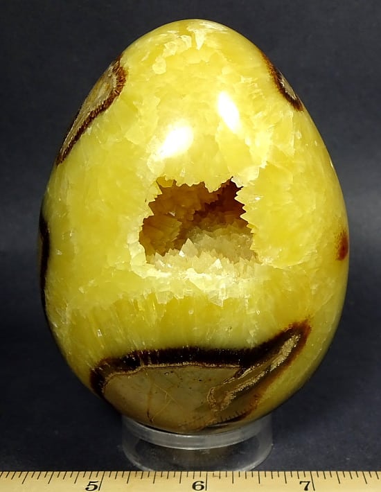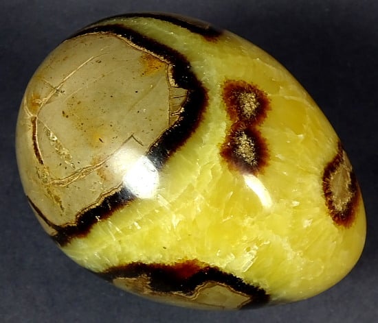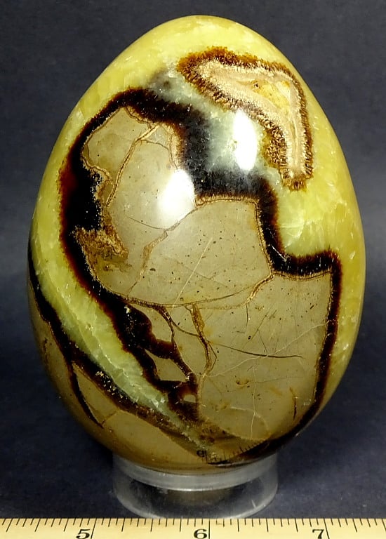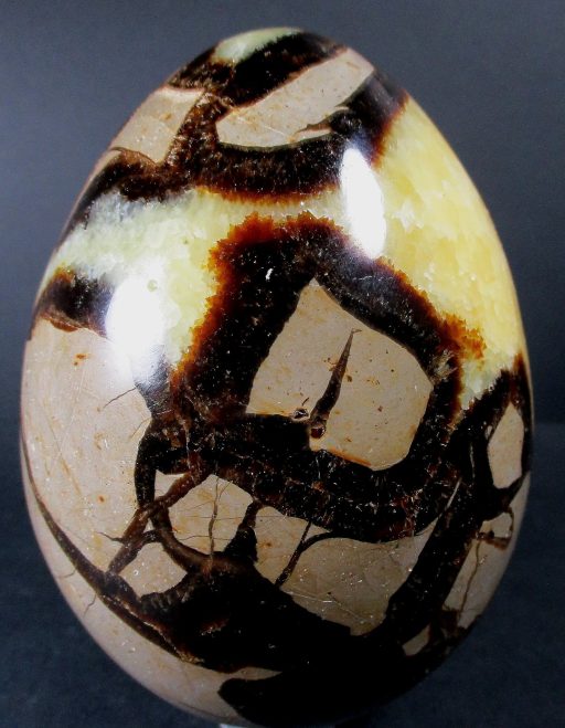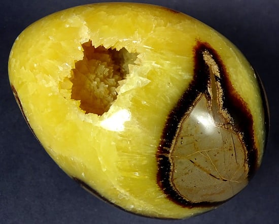 Septarian, also known as a type of Concretion, is a volume of sedimentary rock in which a mineral cement fills the porosity. Concretions are often ovoid or spherical in shape. They form within layers of sedimentary strata that has already been deposited. It is composed of a Carbonate mineral such as Calcite, a Silica such as Chert, Flint or Jasper or an Iron Oxide such as Goethite or Hematite. It is commonly found in Shale, Siltstones and Sandstones.