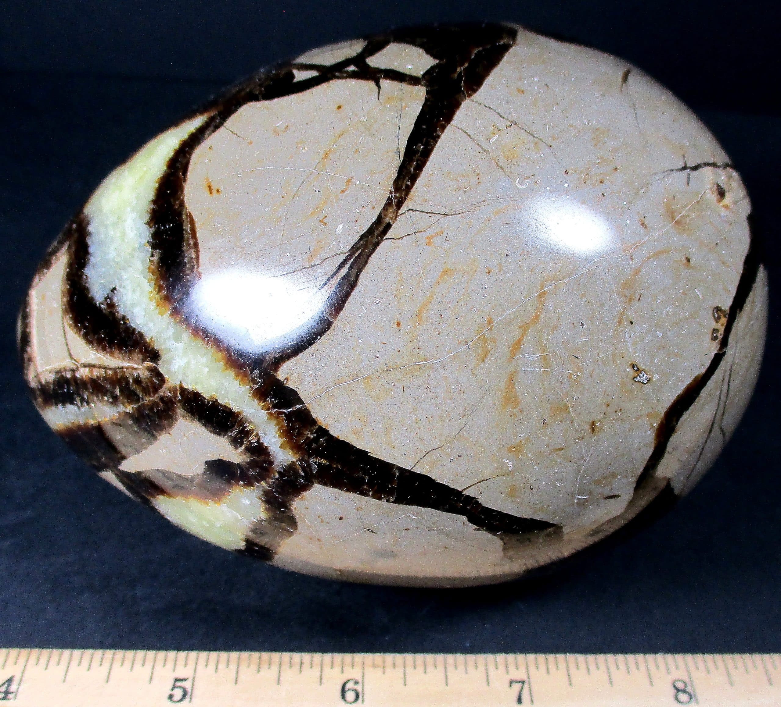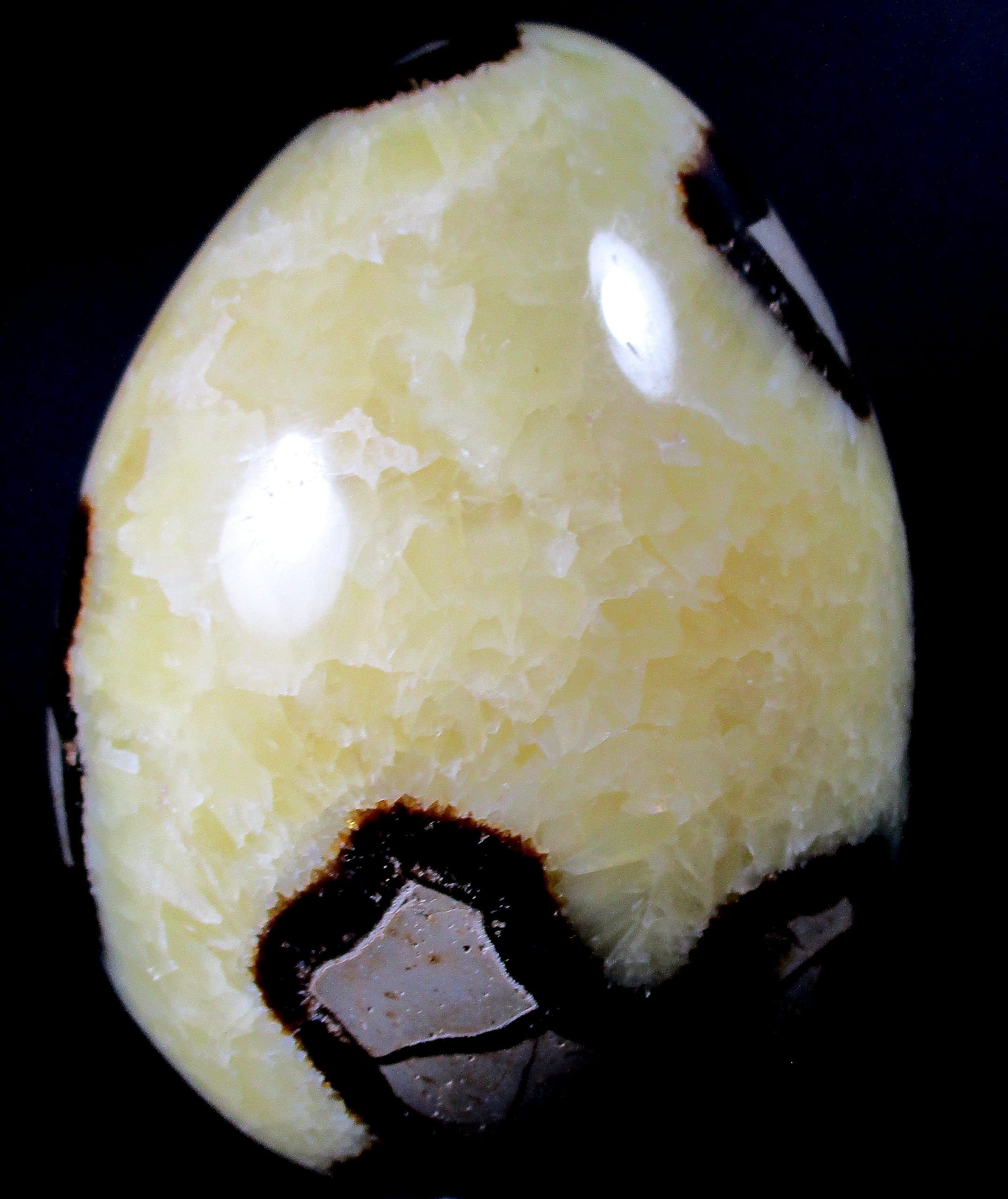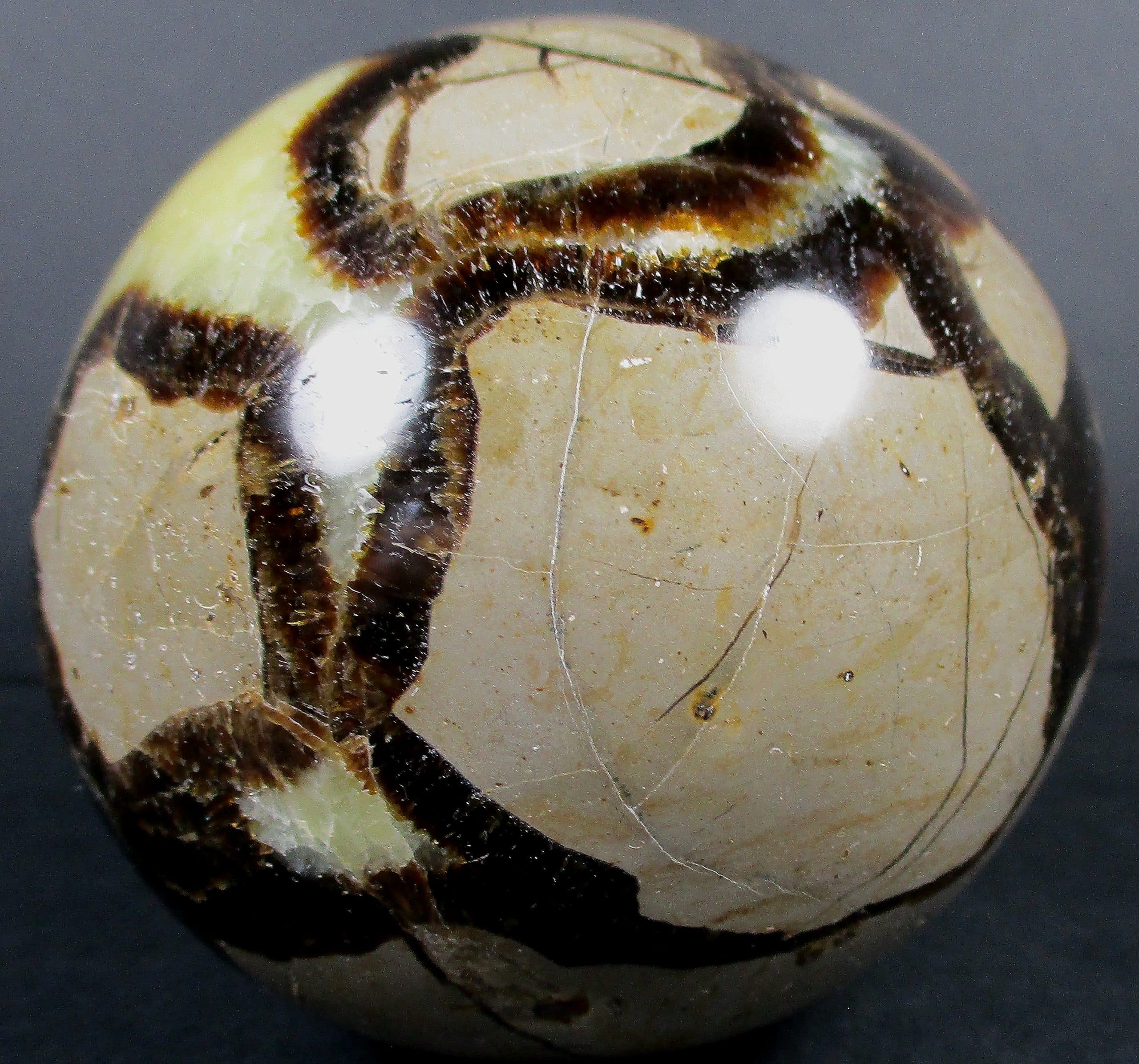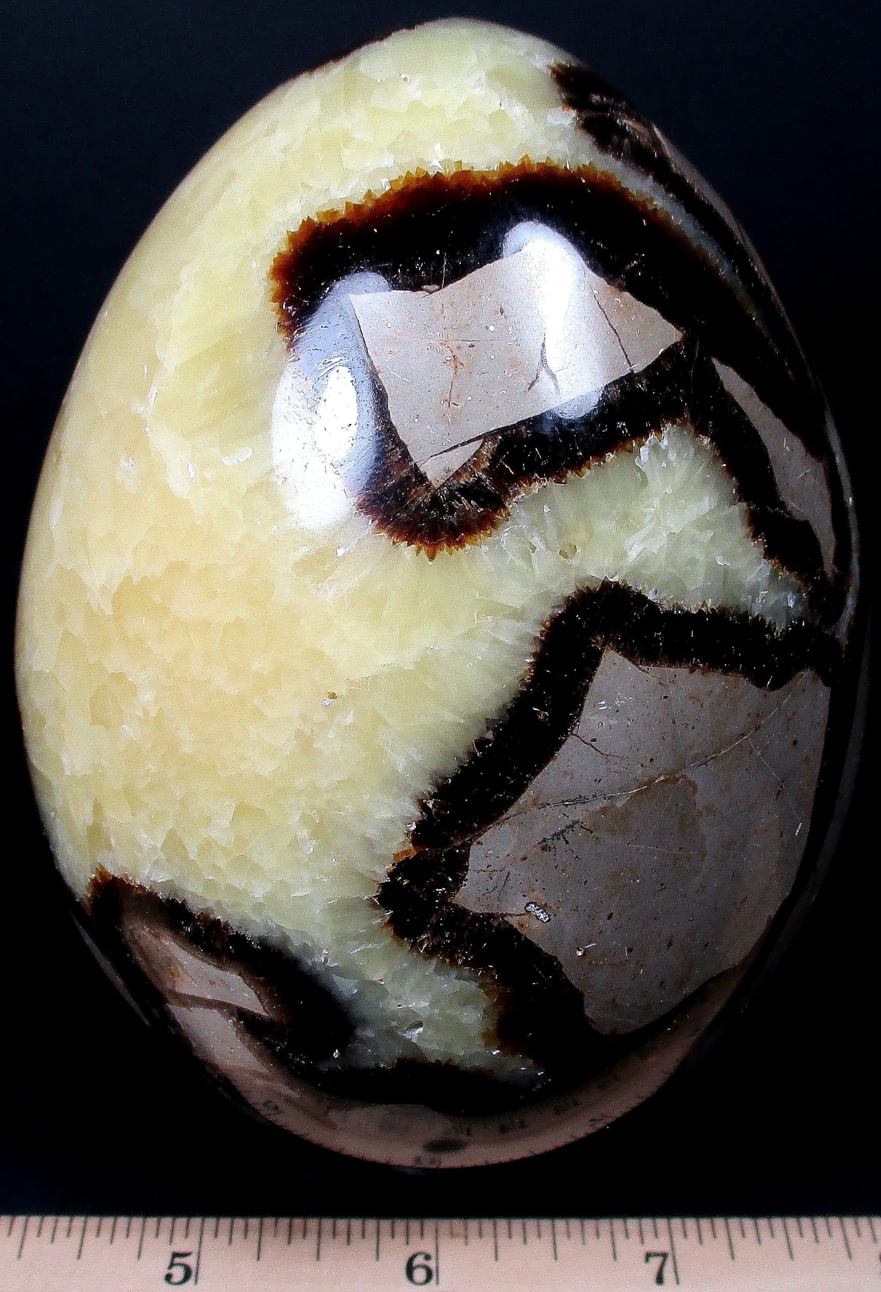Septarian, also known as a type of Concretion, is a volume of sedimentary rock in which a mineral cement fills the porosity. Concretions are often ovoid or spherical in shape. They form within layers of sedimentary strata that has already been deposited. It is composed of a Carbonate mineral such as Calcite, a Silica such as Chert, Flint or Jasper or an Iron Oxide such as Goethite or Hematite. It is commonly found in Shale, Siltstones and Sandstones.