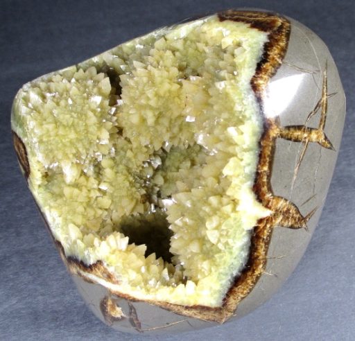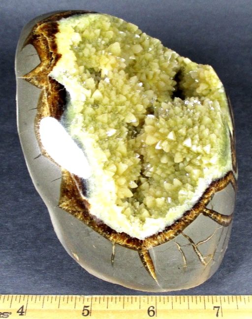 Septarian, also know as a type of Concretion, is a volume of sedimentary rock in which a mineral cement fills the porosity. Concretions are often ovoid or spherical in shape. They form within layers of sedimentary strata that has already been deposited. It is composed of a Carbonate mineral such as Calcite, a Silica such as Chert, Flint or Jasper or an Iron Oxide such as Goethite or Hematite. It is commonly found in Shale, Siltstones and Sandstones.
