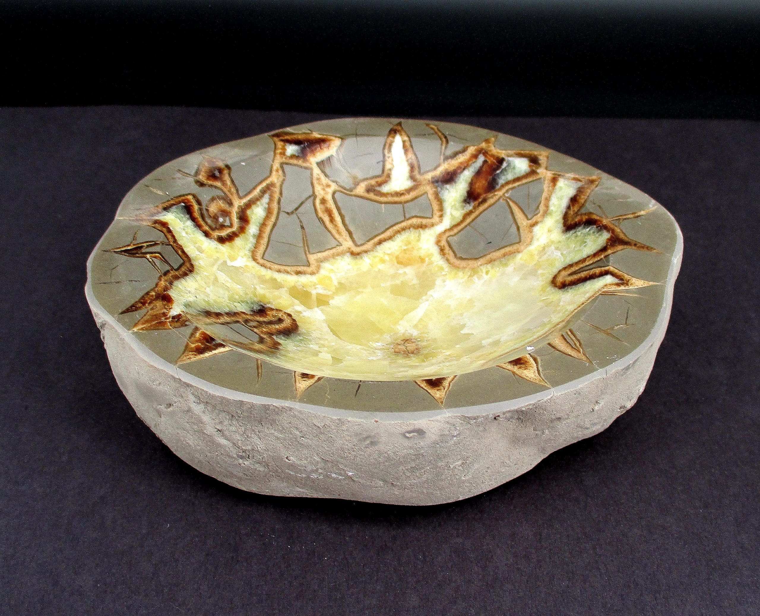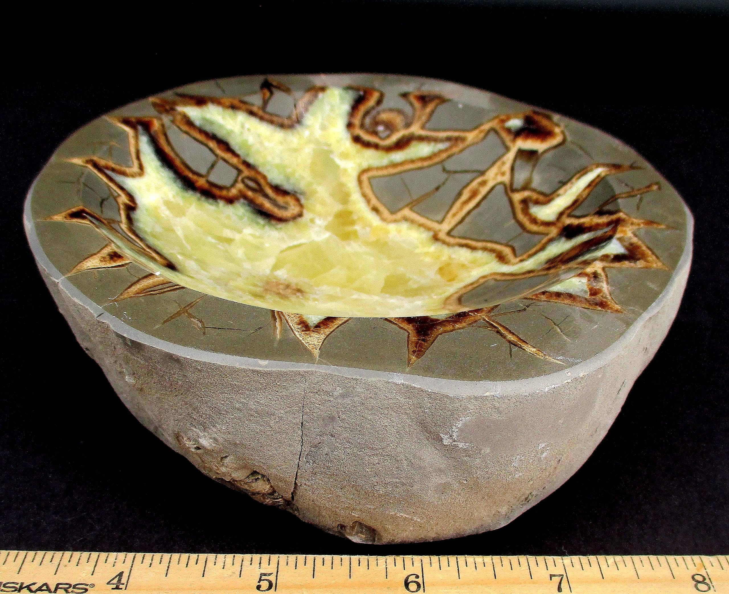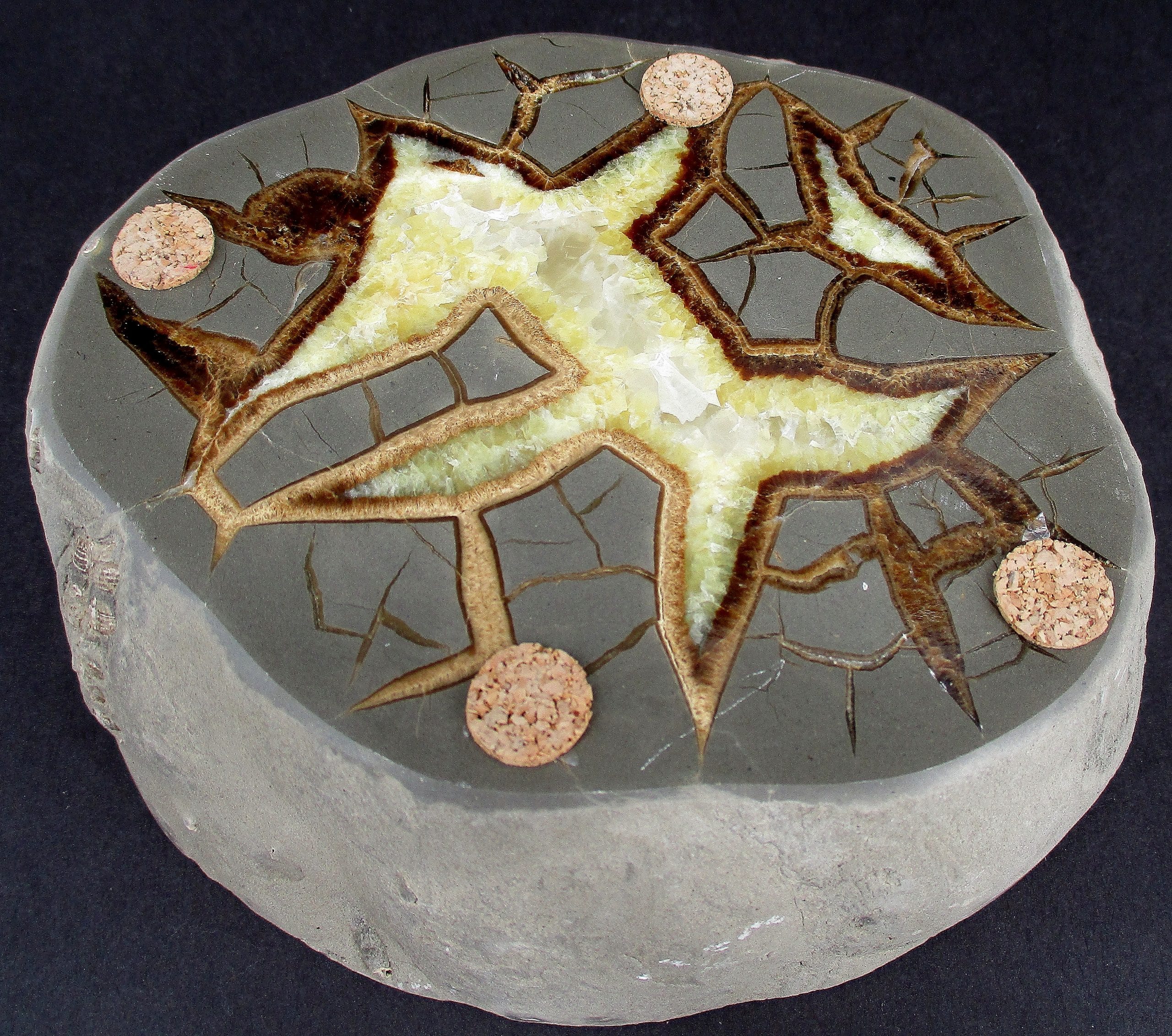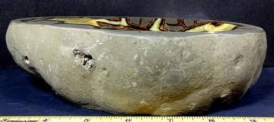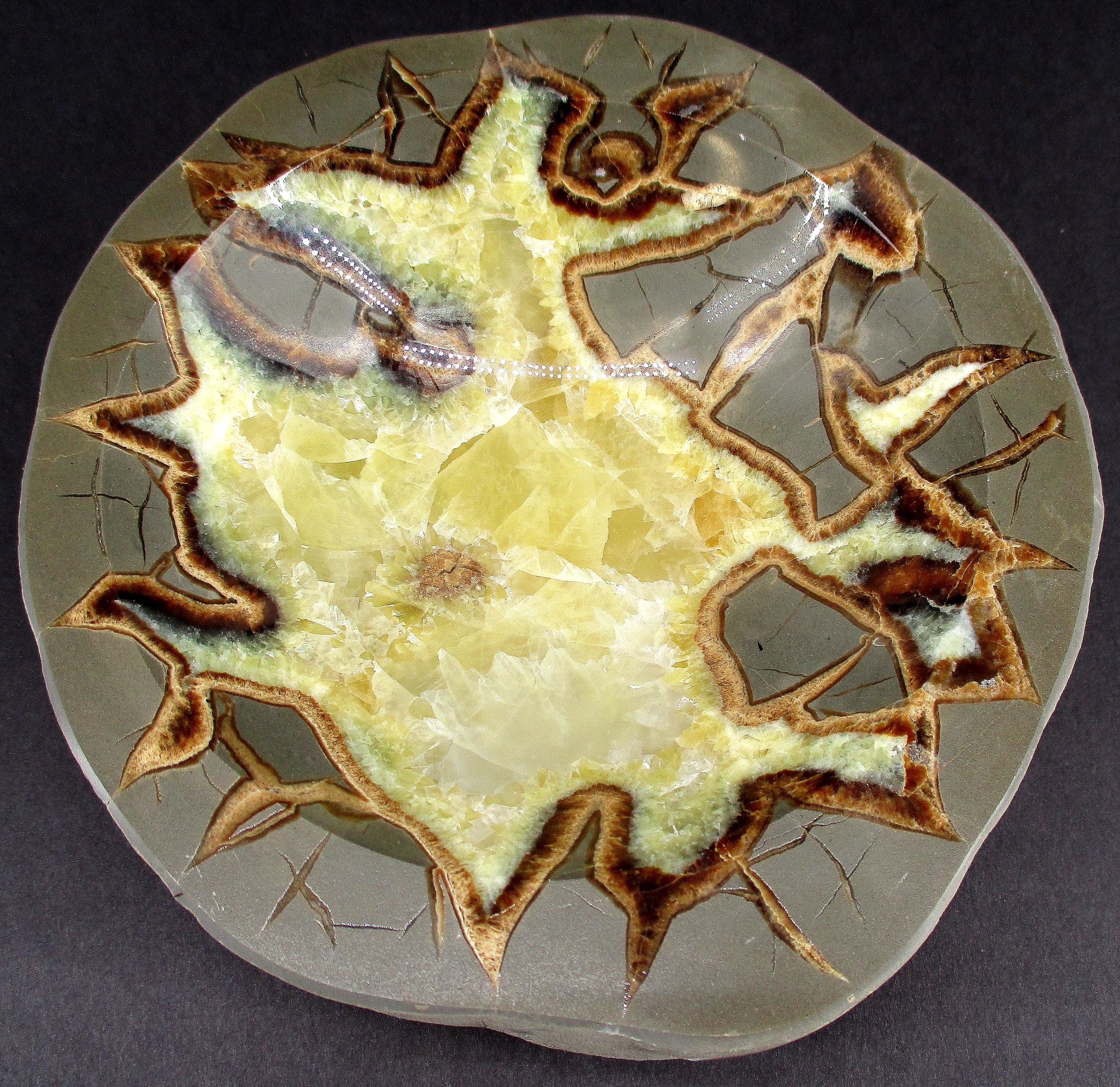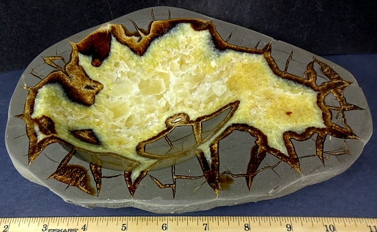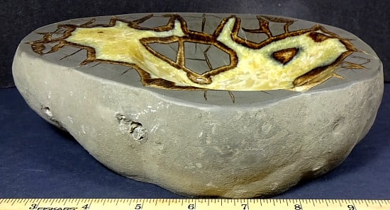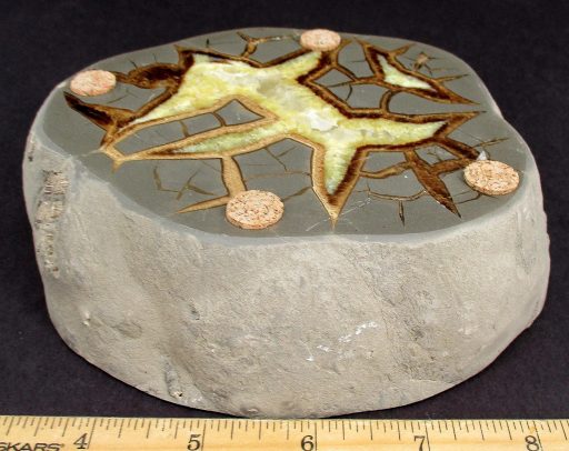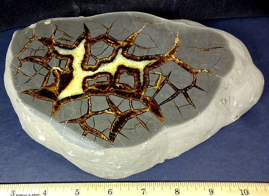 Septarian, also know as a type of Concretion, is a volume of sedimentary rock in which a mineral cement fills the porosity. Concretions are often ovoid or spherical in shape. They form within layers of sedimentary strata that has already been deposited. It is composed of a Carbonate mineral such as Calcite, a Silica such as Chert, Flint or Jasper or an Iron Oxide such as Goethite or Hematite. It is commonly found in Shale, Siltstones and Sandstones.