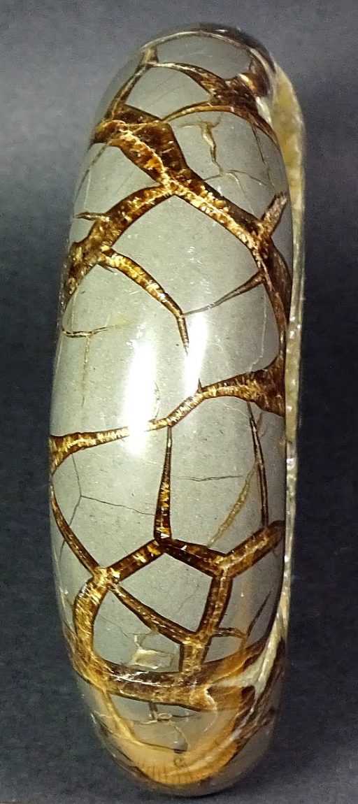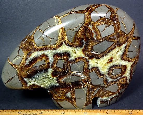 Septarian, also know as a type of Concretion, is a volume of sedimentary rock in which a mineral cement fills the porosity.  Concretions are often ovoid or spherical in shape.  They form within layers of sedimentary strata that has already been deposited.  It is composed of a Carbonate mineral such as Calcite, a Silica such as Chert, Flint or Jasper or an Iron Oxide such as Goethite or Hematite.  It is commonly found in Shale, Siltstones and Sandstones.