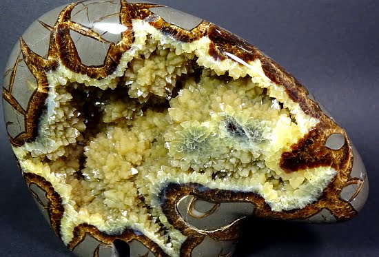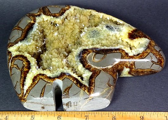 This is a beautiful Yellow and Brown Bear carved from a Utah Septarian Nodule.  The lovely carving has a nice mix of the Yellow Calcite and Brown Aragonite colors and design with a nice polish.  There is a very nice crystal cavity that goes deep inside.   It measures 6 1/8″ nose to tail x 4 5/8″ tall x 1 3/8″ thick.  A great gift to give or receive.