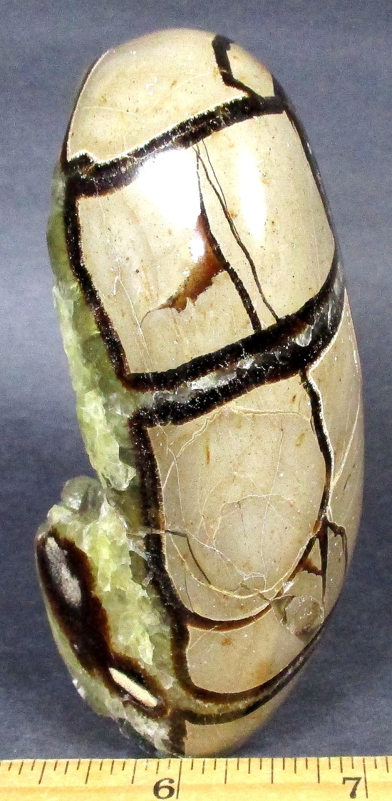 SEP310: Septarian Bowl  – Selection: Carved from a nodule with polished top and bottom, and rough sides. Classic nodule patterning with mixed calcite and sedimentary concretion center.