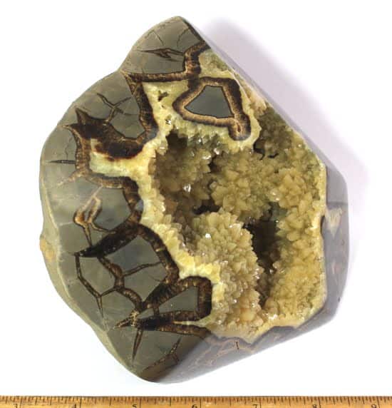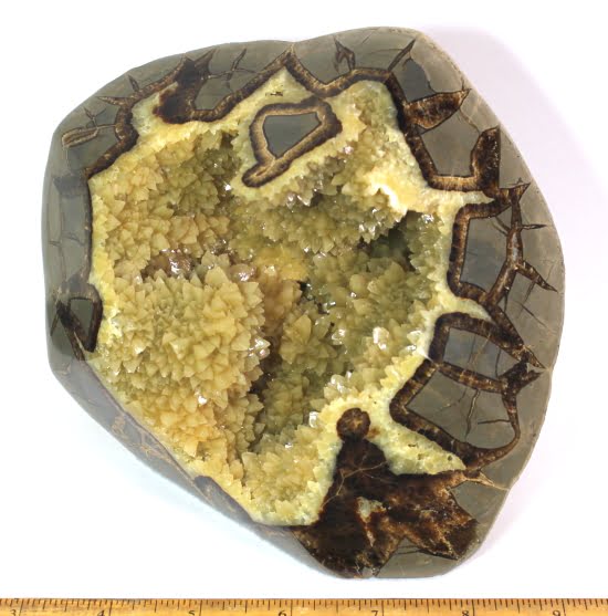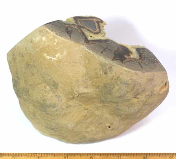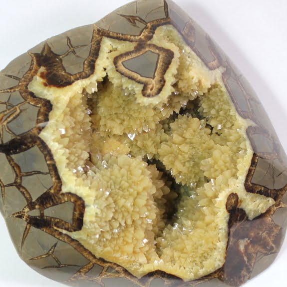 Septarian, also known as a type of Concretion, is a volume of sedimentary rock in which a mineral cement fills the porosity. Concretions are often ovoid or spherical in shape. They form within layers of sedimentary strata that has already been deposited. It is composed of a Carbonate mineral such as Calcite, a Silica such as Chert, Flint or Jasper or an Iron Oxide such as Goethite or Hematite. It is commonly found in Shale, Siltstones and Sandstones.
