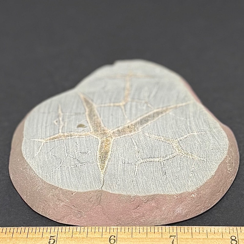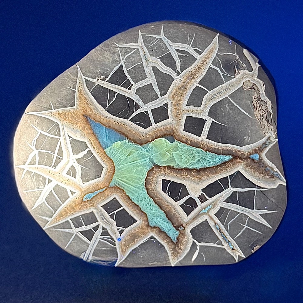Appearance: Cut from Septarian Nodule.  Concretion interior minerals – Calcite and Aragonite. UV fluorescent.