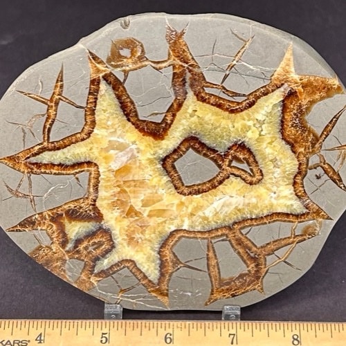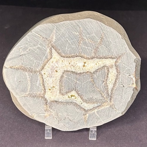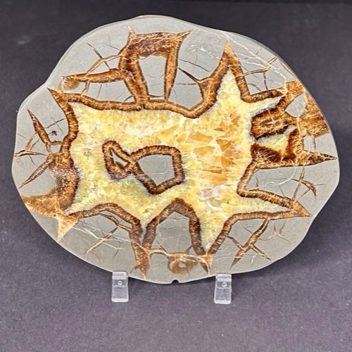 SEP400: Septarian Slab  – Selection: Slabbed nodule with polished front and smooth, unpolished back. Classic nodule patterning of a mass calcite center, with finer aragonite outlines and background  patterns.