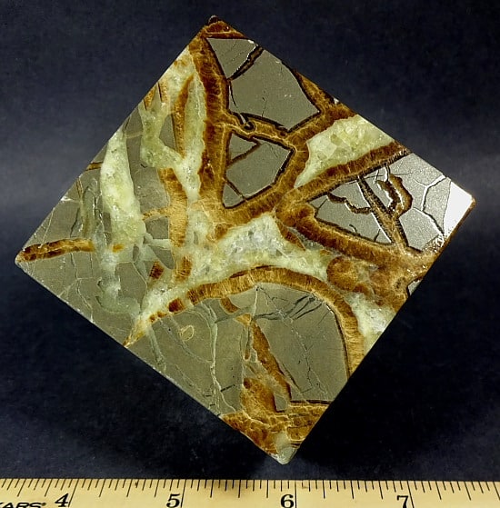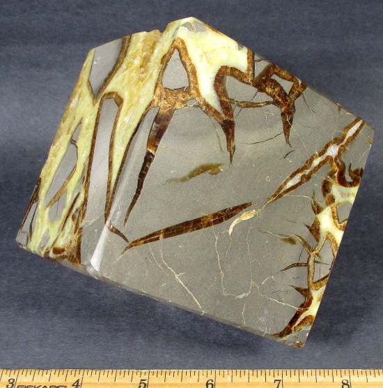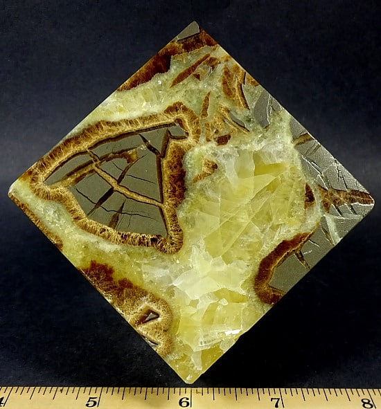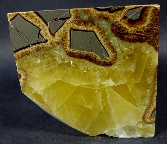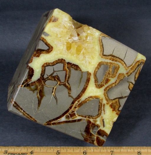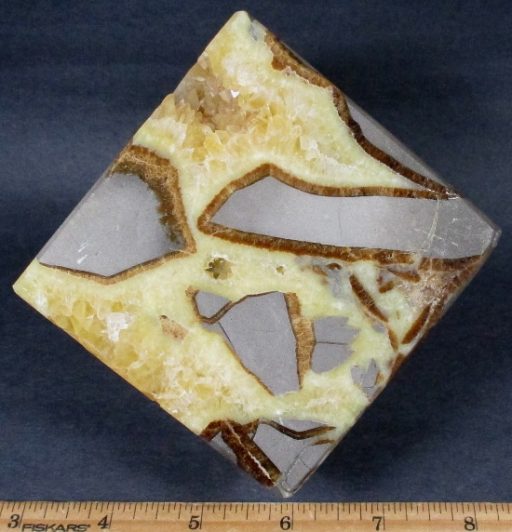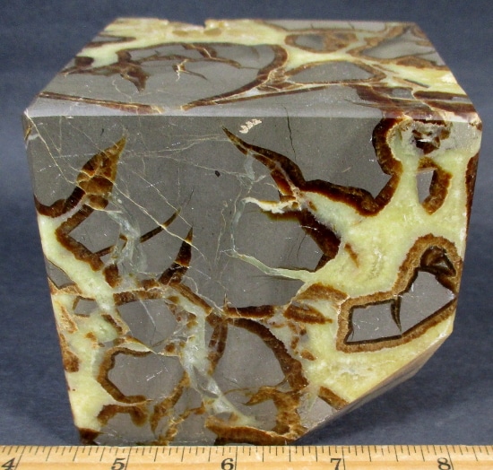 Septarian, also known as a type of Concretion, is a volume of sedimentary rock in which a mineral cement fills the porosity. Concretions are often ovoid or spherical in shape. They form within layers of sedimentary strata that has already been deposited. It is composed of a Carbonate mineral such as Calcite, a Silica such as Chert, Flint or Jasper or an Iron Oxide such as Goethite or Hematite. It is commonly found in Shale, Siltstones and Sandstones.