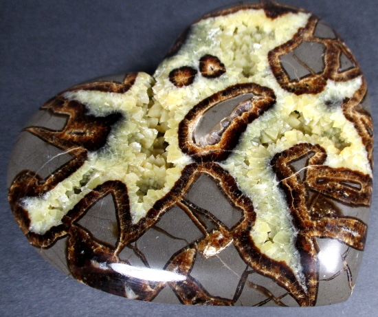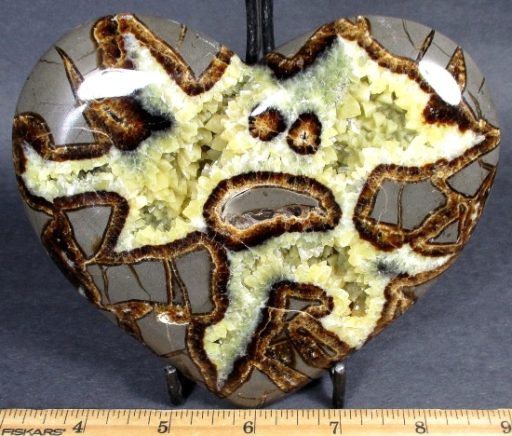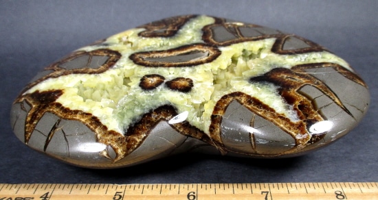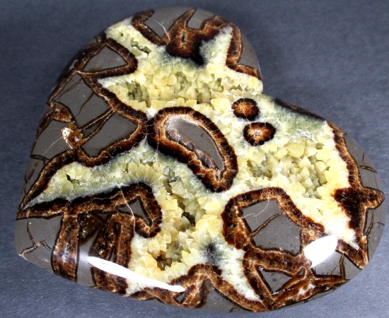 Septarian, also know as a type of Concretion, is a volume of sedimentary rock in which a mineral cement fills the porosity. Concretions are often ovoid or spherical in shape. They form within layers of sedimentary strata that has already been deposited. It is composed of a Carbonate mineral such as Calcite, a Silica such as Chert, Flint or Jasper or an Iron Oxide such as Goethite or Hematite. It is commonly found in Shale, Siltstones and Sandstones.