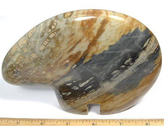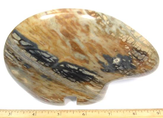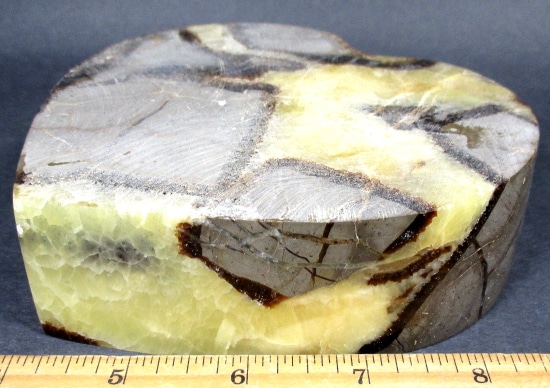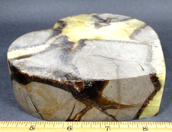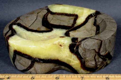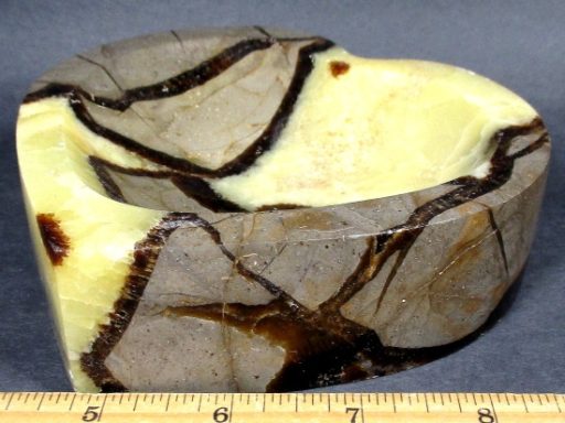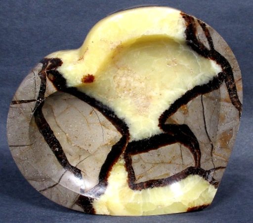 Here is a beautiful heart shaped bowl carved from a Septarian Nodule from Madagascar.  This very nice piece has a pretty Yellow Calcite surrounded by Brown Aragonite borders all around with a good polish. It measures 5 1/8″ wide x 4 7/8″ x  1 1/2″ tall.  This would make an excellent gift or addition to your collection.