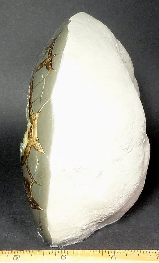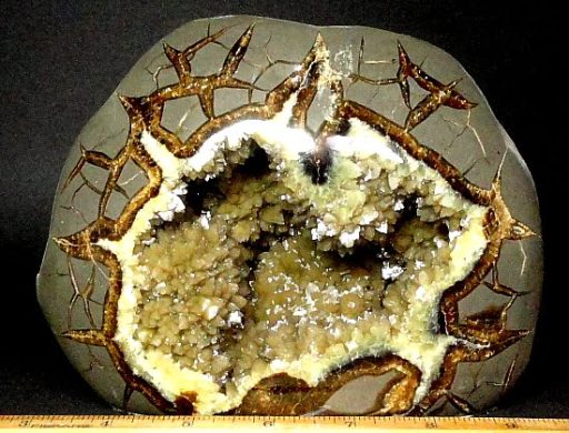 This is a different item; a very nice Free Form superbly carved from a Septarian Nodule from Utah.  This lovely Free Form has different interesting designs, beautiful Yellow Calcite open crystal cavity with lots of smaller White Calcite crystals and accented by the Brown Aragonite. It measures 6 5/8″ wide x 3 1/4″ thick x 5″ tall and has a nice polish on the front side with felt on the bottom.  An excellent display item or great gift for the Septarian collector.