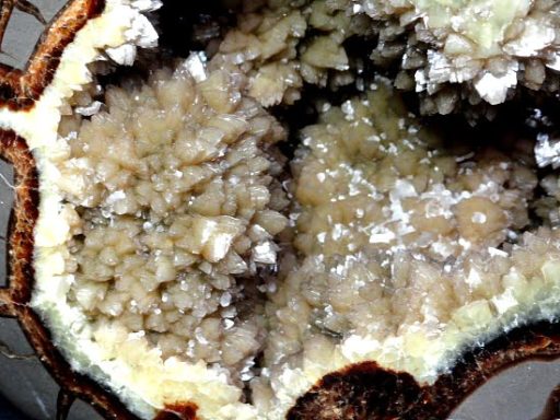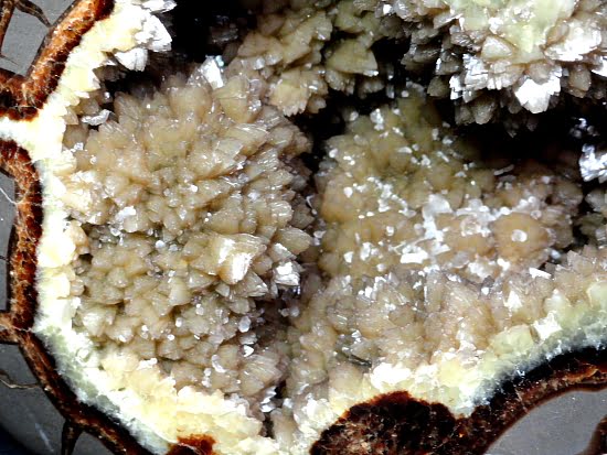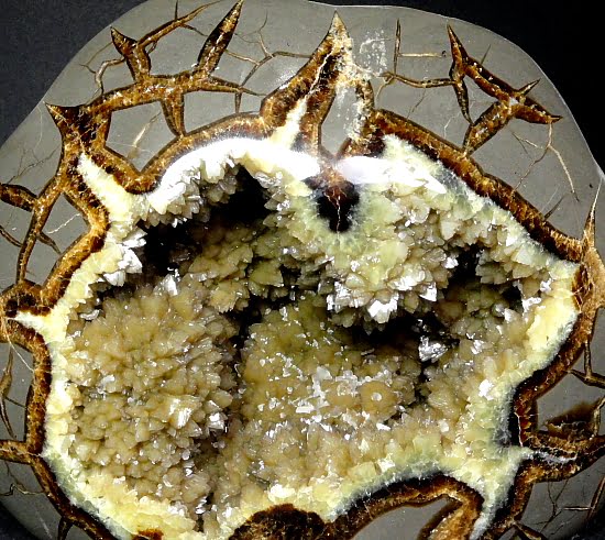 Septarian, also know as a type of Concretion, is a volume of sedimentary rock in which a mineral cement fills the porosity.  Concretions are often ovoid or spherical in shape.  They form within layers of sedimentary strata that has already been deposited.  It is composed of a Carbonate mineral such as Calcite, a Silica such as Chert, Flint or Jasper or an Iron Oxide such as Goethite or Hematite.  It is commonly found in Shale, Siltstones and Sandstones.