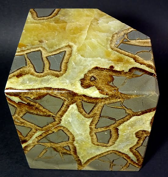 Here’s a new twist to an old favorite, a beautiful Sphere carved from a Septarian Nodule with a stand from Madagascar.  This beautiful sphere and stand have pretty Yellow Calcite that contrasts the Brown Aragonite with an outstanding design and lots of character. The sphere measures 3 1/4″ in diameter and the stand 2 7/8″ x 1 1/8″ both with a nice exterior polish.  The interesting set would make a great gift or a nice addition for your collection.