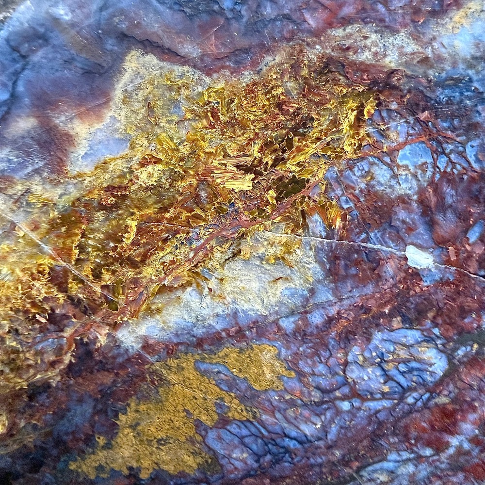 Pietersite was discovered by Sid Pieters in 1962 while prospecting farmland in Namibia, Africa and was named after him in 1964. Currently there are only two known sources of Pietersite: Africa and China. Pietersite is considered a type of Tiger Eye, having the same properties but with different patterns due to its brecciated formation. While Pietersite has the lovely chatoyancy of Tiger Eye, it is not found in continuously structured bands but rather in swirls, swathes and fibrous (sometimes linear) segments. They appear chaotic and can exist in many directions like bold paint strokes. African Pietersite is the most sought after due to its wide range of color which include various blues, golds, and reds with blue being the rarest followed by red.