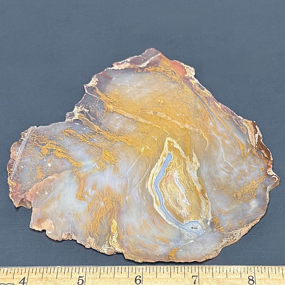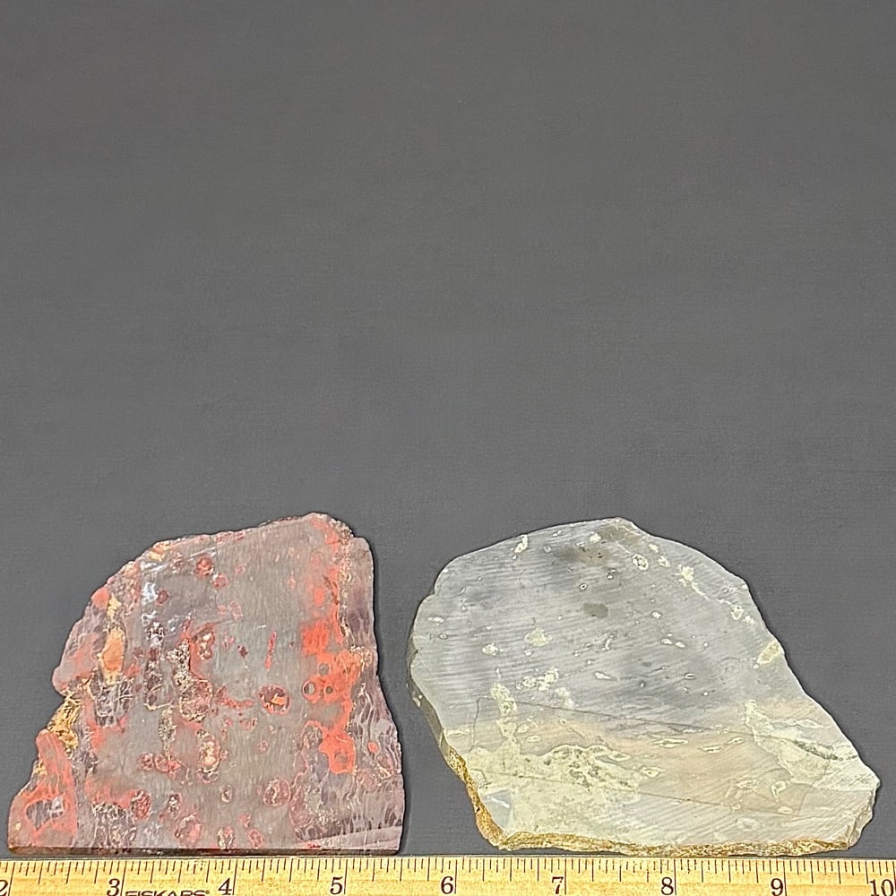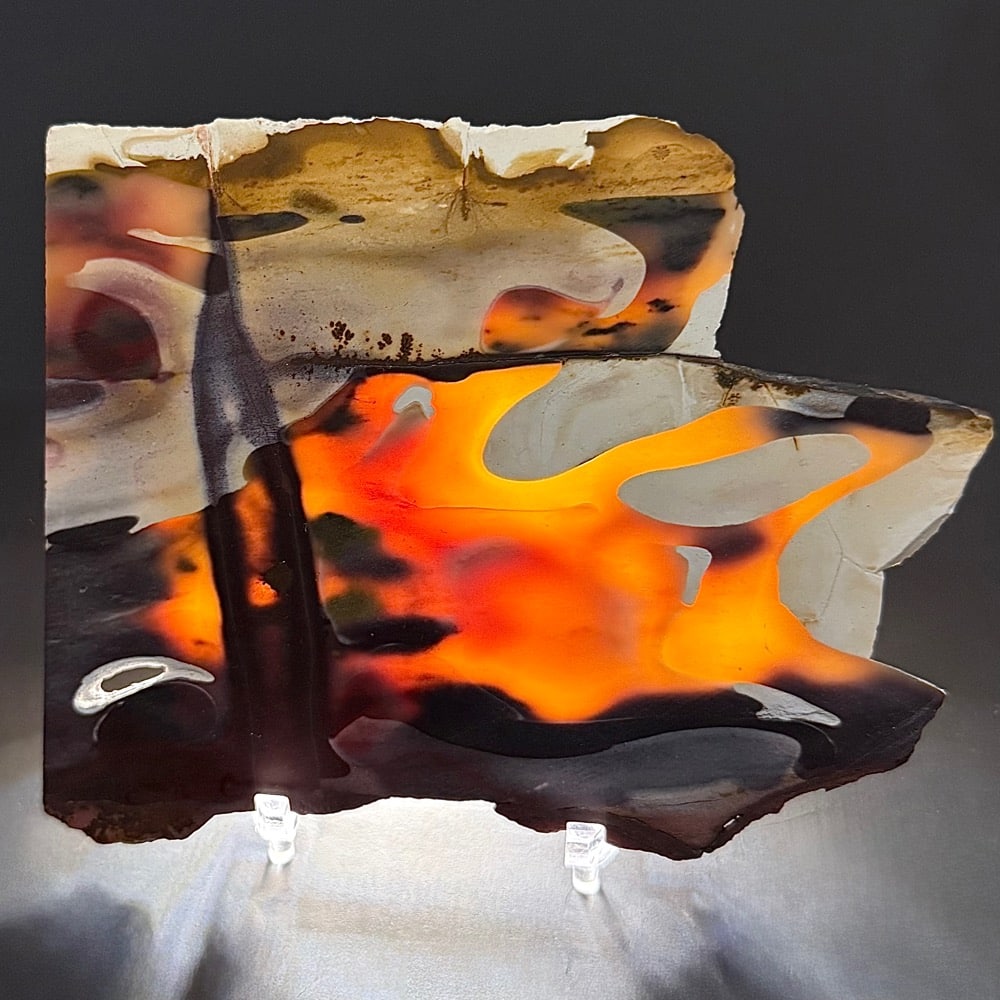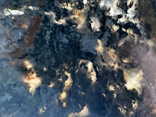 Please note: The last photos, the slab is wet and shot with backlighting. This is a visual representation of a potential outcome, if polished, and a display of translucence.