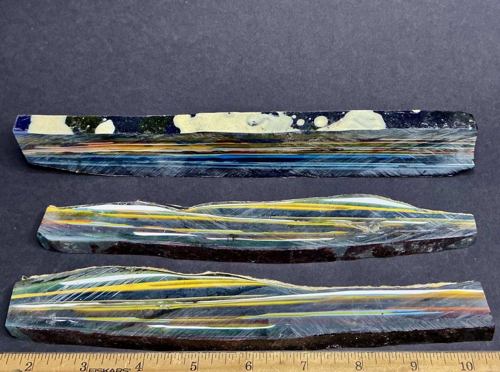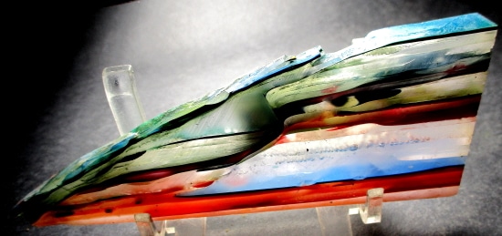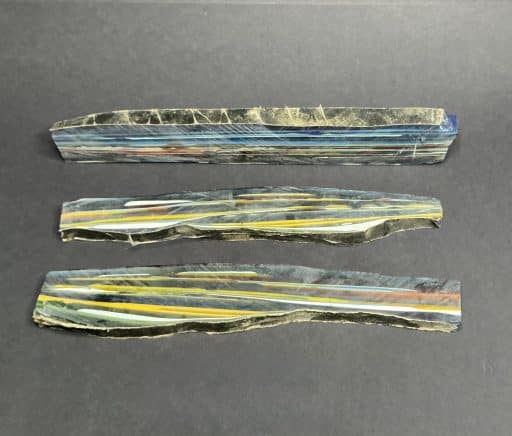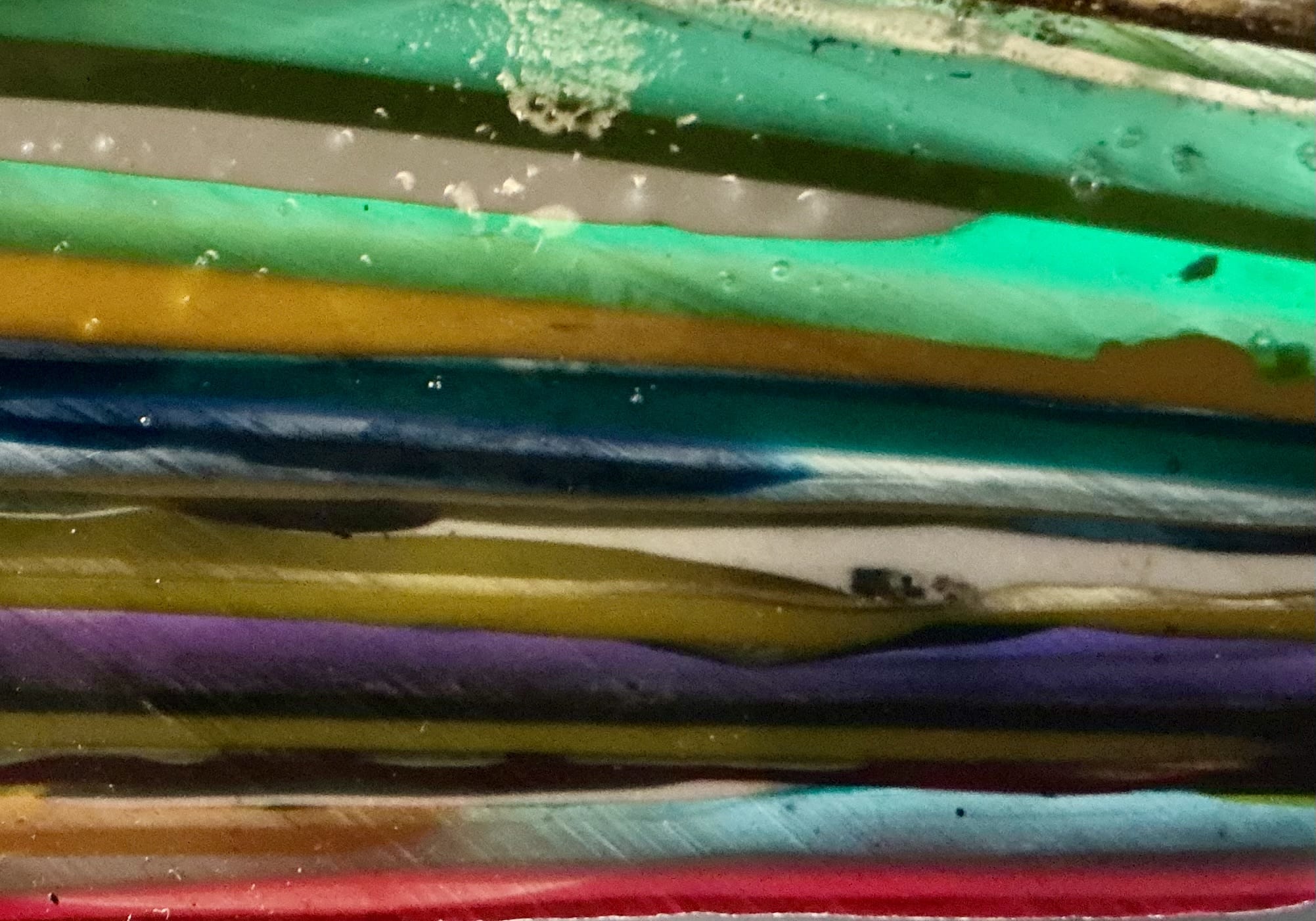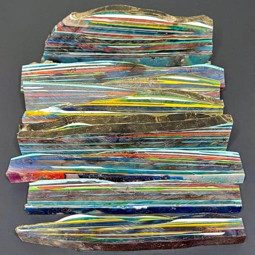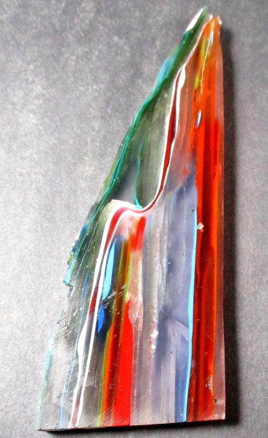 “Surfite” or “Surf Stone” is a byproduct of the creation of surf boards. During the ‘glassing’ process a thick layer of fibgerglass cloth is laid over a foam board blank. A heavy coat of epoxy resin is poured to saturate the top and what doesn’t soak into the cloth spills over the edges and dries into layers on the floor. These hardened layers of resin eventually accumulate and need to be chipped up and removed to make space to work. These chunks, sadly, are most often thrown away as ‘waste.’