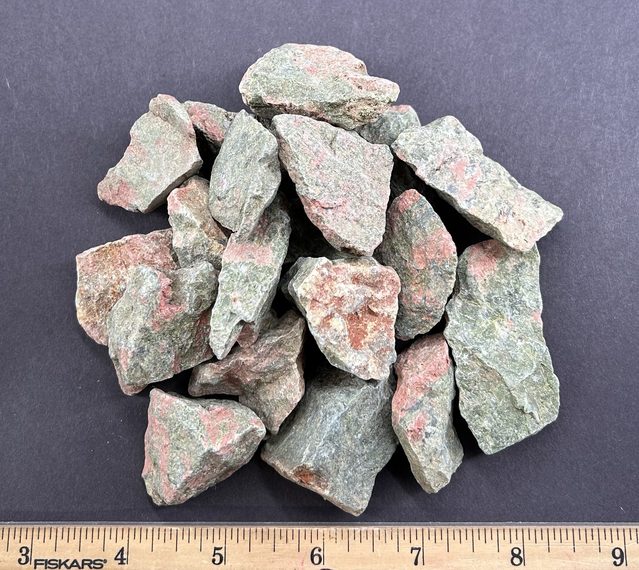Unakite is an altered Granite composed of pink Feldspar, green Epidote and clear Quartz. It exists in various shades of green and pink and is usually mottled in appearance. Good quality Unakite is considered a semiprecious stone and will take a good polish and is often used in jewelry and other lapidary work.
