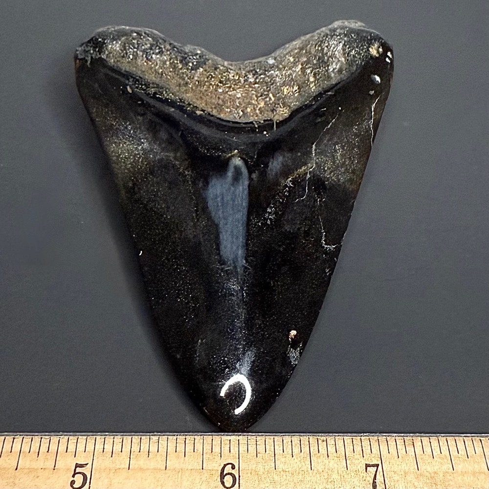 This tooth is from the largest shark ever known to live.  The Carcharocles Megalodon sometimes ranged in size up to 60′ in length and weighed over 52 tons.  This huge monster is the largest predatory fish that ever lived, second only in size to the sperm whale.  Fossil teeth have been found that exceed 7 inches in length.  These sharks lived in the Miocene period some 23 million years ago to the Mid Pliocene times, 3.6 million years ago.  This specimen is from South Carolina.