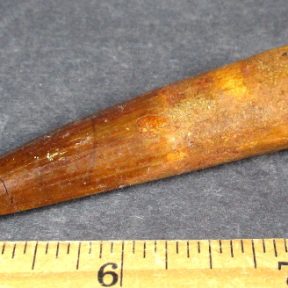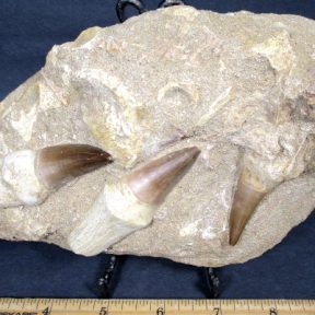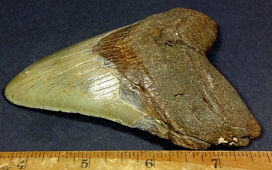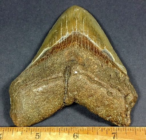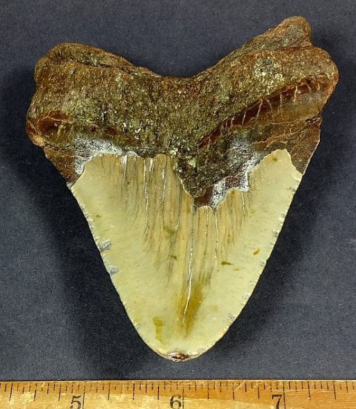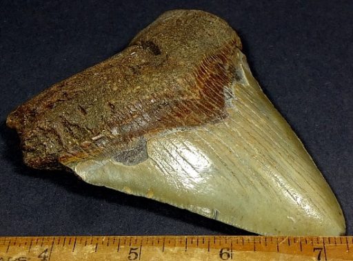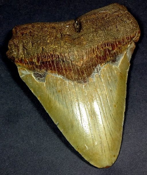 This tooth is from the largest shark ever known to live. The Carcharocles Megalodon sometimes ranged in size up to 60′ in length and weighed over 52 tons. This huge monster is the largest predatory fish that ever lived, second only in size to the sperm whale. Fossil teeth have been found that exceed 7 inches in length. These sharks lived in the Miocene period some 23 million years ago to the Mid Pliocene times, 3.6 million years ago. This specimen is from South Carolina.