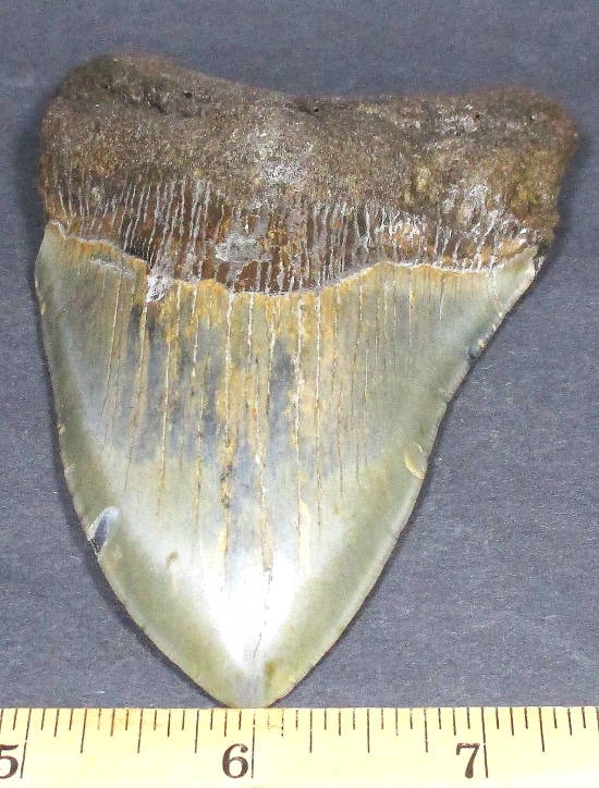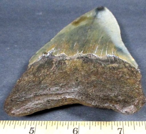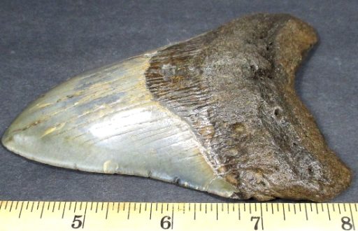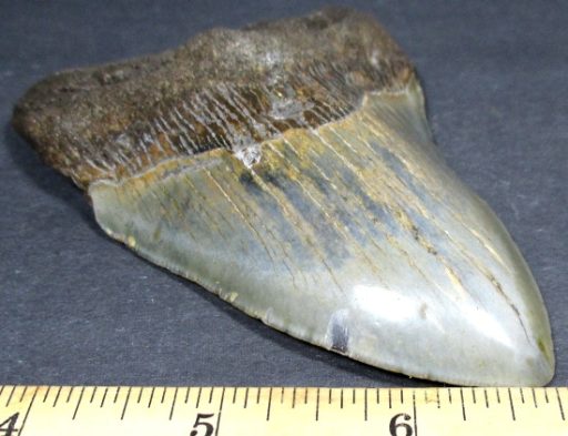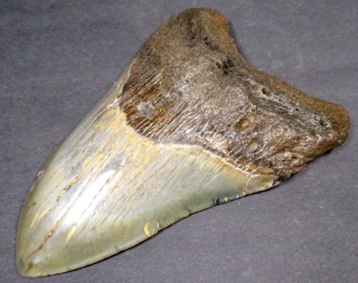 This tooth is from the largest shark ever known to live. The Carcharocles Megalodon sometimes ranged in size up to 60′ in length and weighed over 52 tons. This huge monster is the largest predatory fish that ever lived, second only in size to the sperm whale. Fossil teeth have been found that exceed 7 inches in length. These sharks lived in the Miocene period some 23 million years ago to the Mid Pliocene times, 3.6 million years ago. This specimen is from South Carolina.