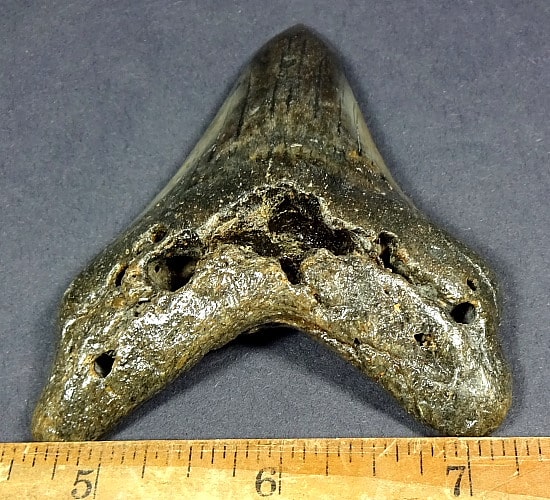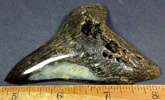 This tooth is from the largest shark ever known to live. The Carcharocles Megalodon sometimes ranged in size up to 60′ in length and weighed over 52 tons. This huge monster is the largest predatory fish that ever lived, second only in size to the sperm whale. Fossil teeth have been found that exceed 7 inches in length. These sharks lived in the Miocene period some 23 million years ago to the Mid Pliocene times, 3.6 million years ago. This specimen is from South Carolina.