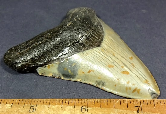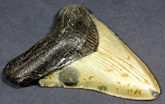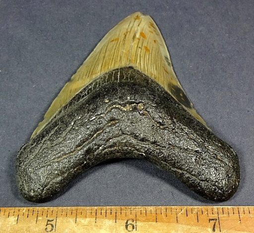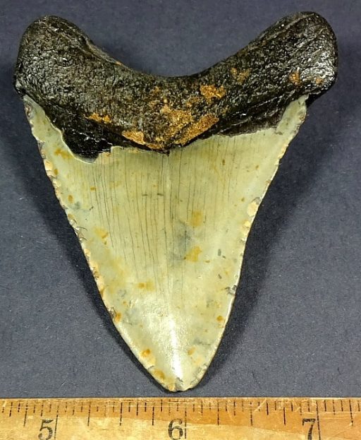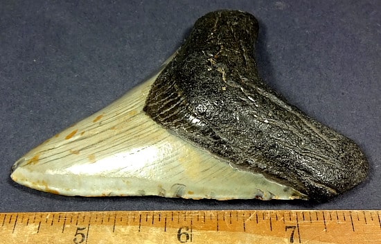 This tooth is from the largest shark ever known to live. The Carcharocles Megalodon sometimes ranged in size up to 60′ in length and weighed over 52 tons. This huge monster is the largest predatory fish that ever lived, second only in size to the sperm whale. Fossil teeth have been found that exceed 7 inches in length. These sharks lived in the Miocene period some 23 million years ago to the Mid Pliocene times, 3.6 million years ago. This specimen is from South Carolina.