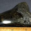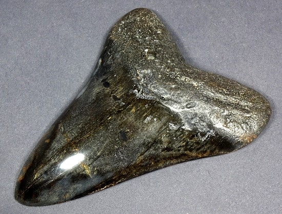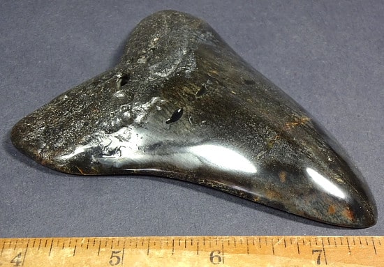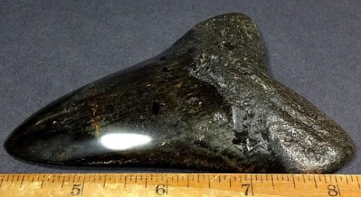 This is a complete and very unique fossil Shark Tooth from the Megalodon Shark.  This tooth specimen measures 4″ diagonally x 3 1/4″ wide x 3/4″ thick.  The Tooth has nice dark grey to black colored enamel and has been polished.  An awesome fossil tooth.