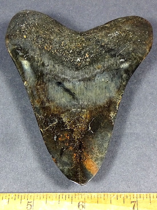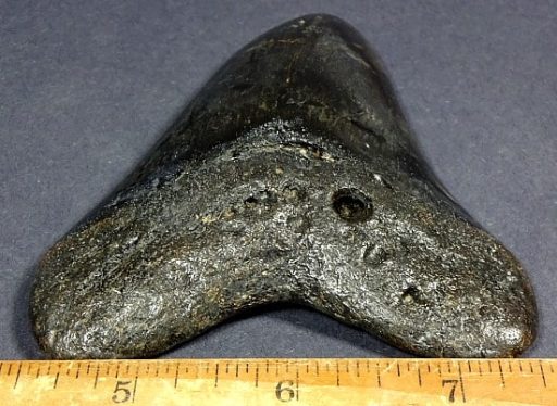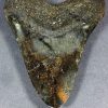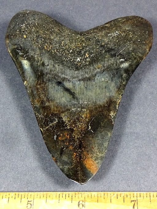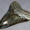 This tooth is from the largest shark ever known to live.  The Carcharocles Megalodon sometimes ranged in size up to 60′ in length and weighed over 52 tons.  This huge monster is the largest predatory fish that ever lived, second only in size to the sperm whale.  Fossil teeth have been found that exceed 7 inches in length.  These sharks lived in the Miocene period some 23 million years ago to the Mid Pliocene times, 3.6 million years ago.  This specimen is from South Carolina.