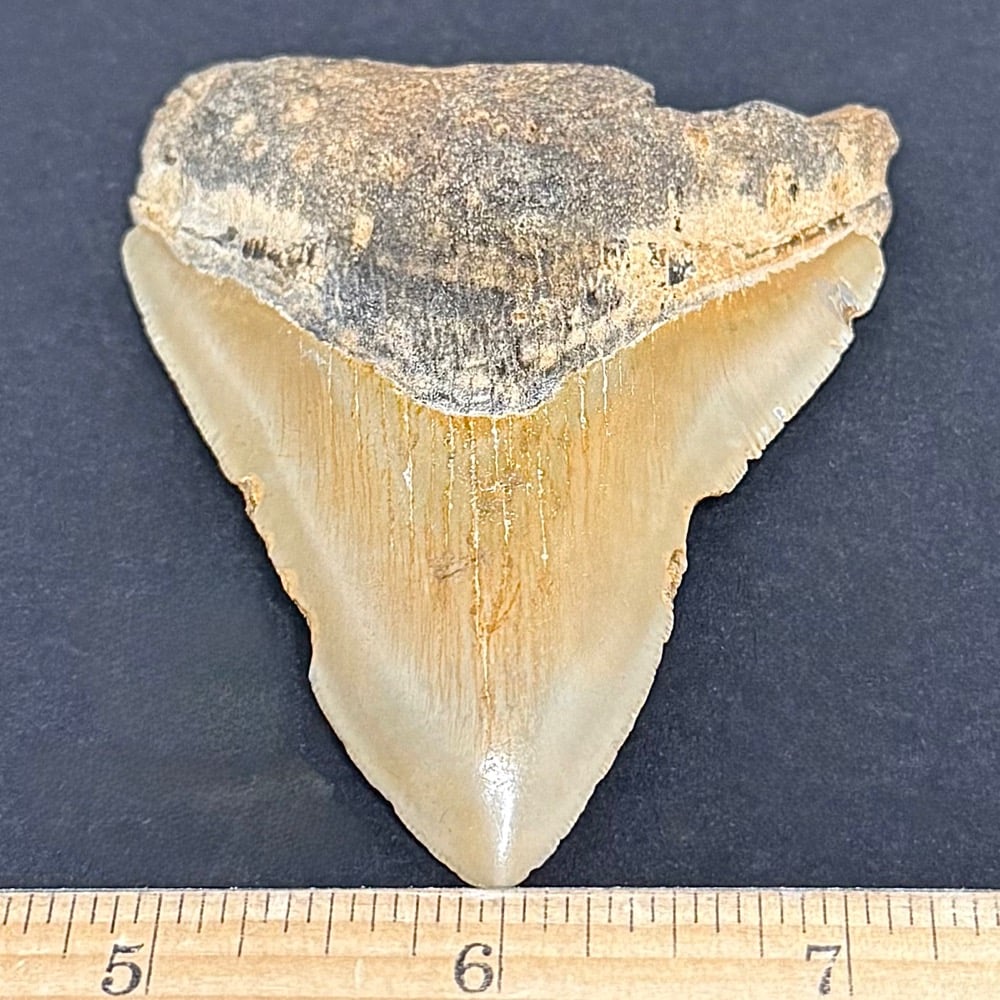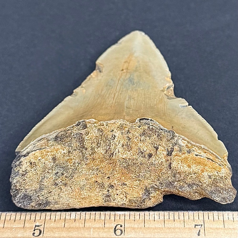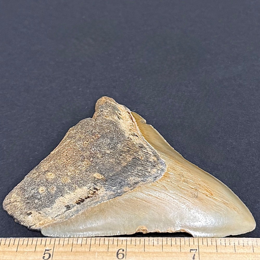 Appearance: The Shark Tooth has a mostly brown colored enamel with lighter highlights and also brown colored root lobe. This is a complete fossil Shark Tooth from the Megalodon Shark.
