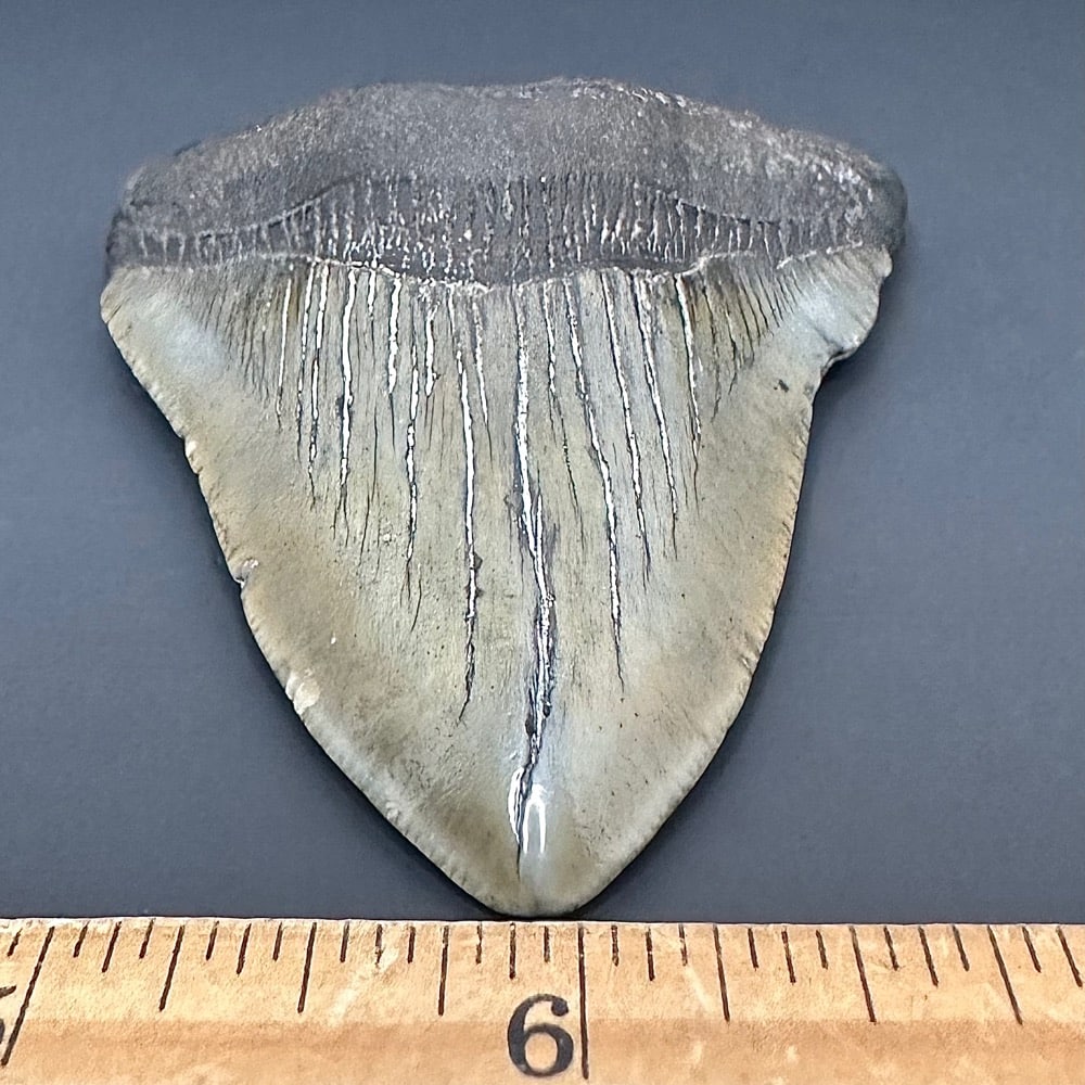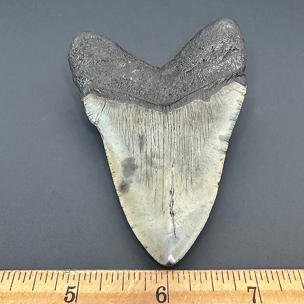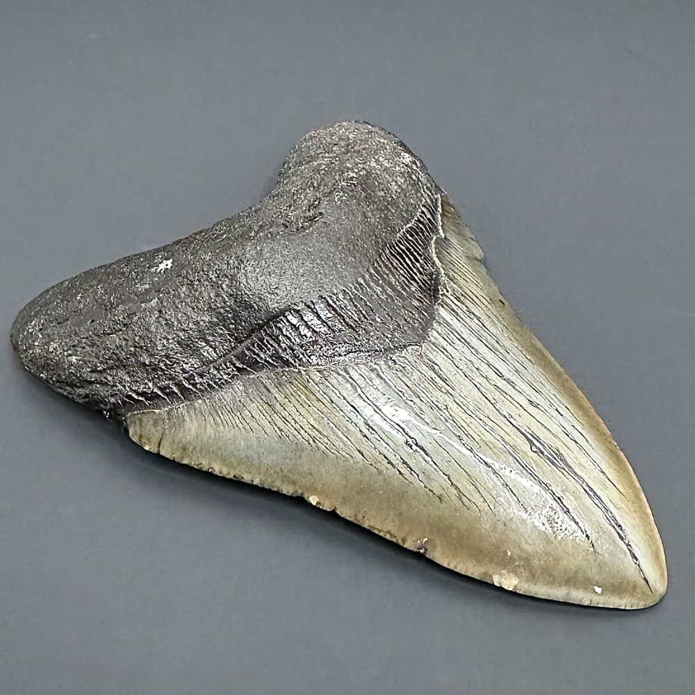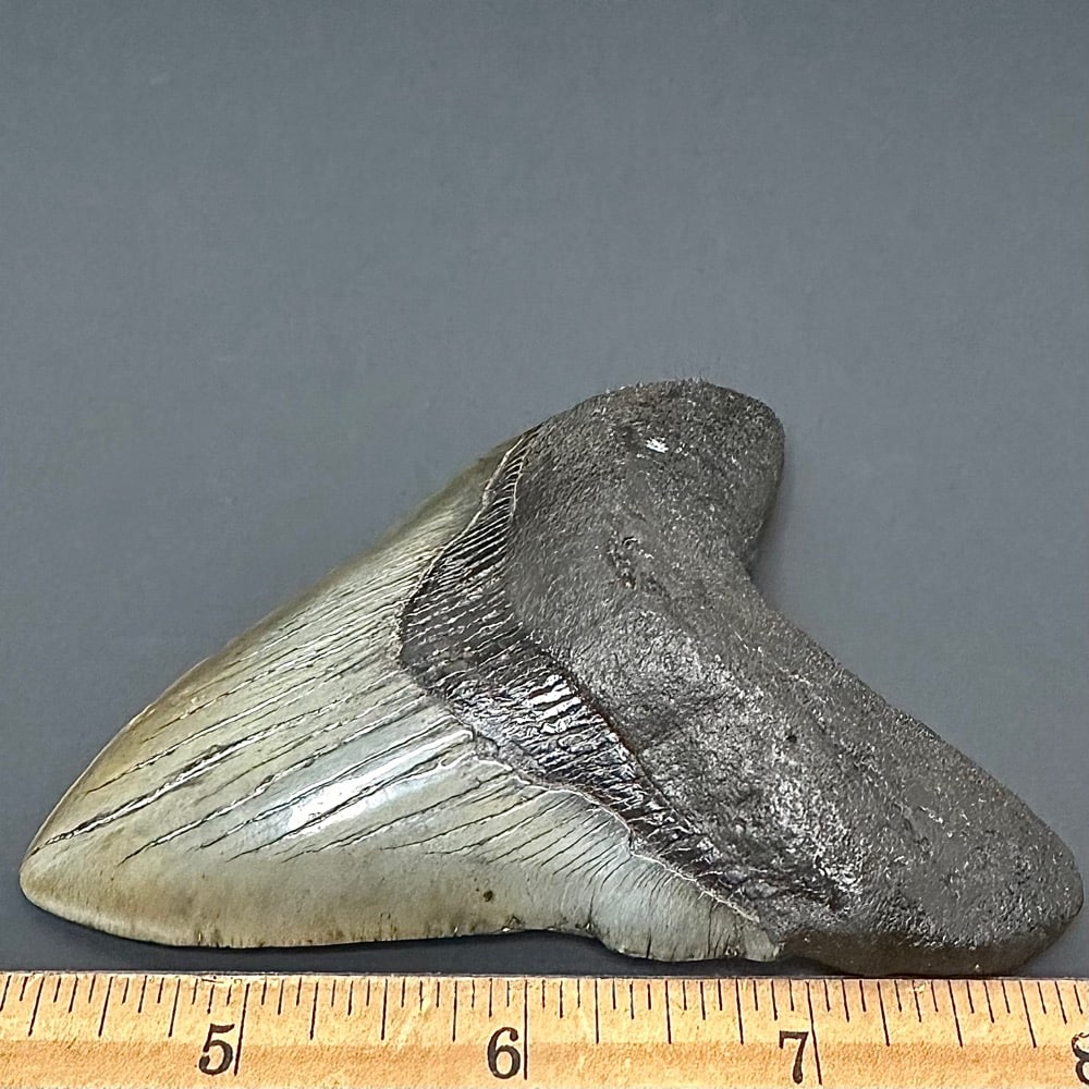 This tooth is from the largest shark ever known to live. The Carcharocles Megalodon sometimes ranged in size up to 60′ in length and weighed over 52 tons. This huge monster is the largest predatory fish that ever lived, second only in size to the sperm whale. Fossil teeth have been found that exceed 7 inches in length. These sharks lived in the Miocene period some 23 million years ago to the Mid Pliocene times, 3.6 million years ago. This specimen is from South Carolina.