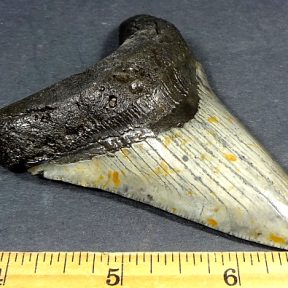 This tooth is from the largest shark ever known to live.  The Carcharocles Megalodon sometimes ranged in size up to 60′ in length and weighed over 52 tons.  This huge monster is the largest predatory fish that ever lived, second only in size to the sperm whale.  Fossil teeth have been found that exceed 7 inches in length.  These sharks lived in the Miocene period some 23 million years ago to the Mid Pliocene times, 3.6 million years ago.  This specimen is from South Carolina.