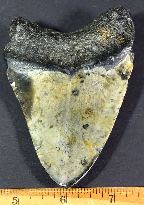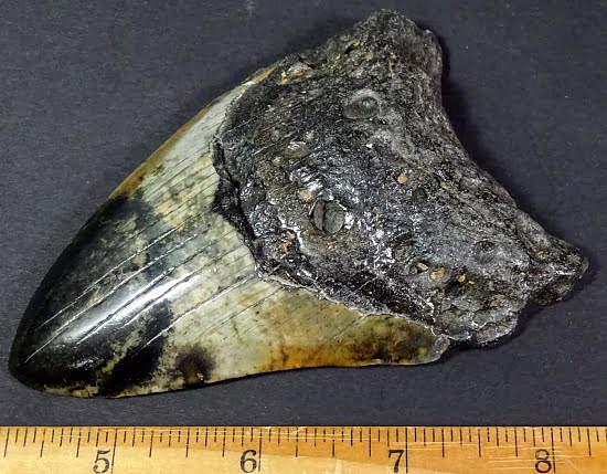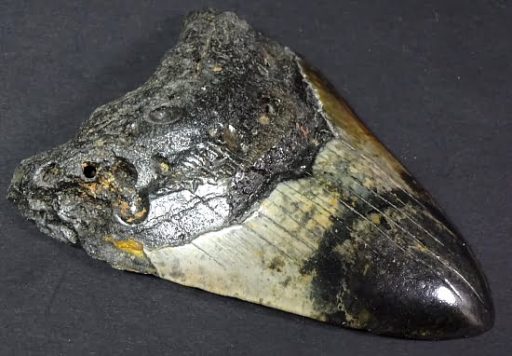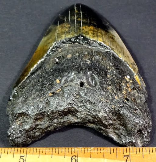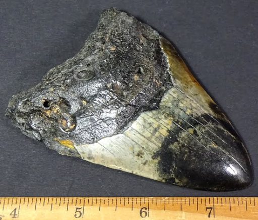 This tooth is from the largest shark ever known to live.  The Carcharocles Megalodon sometimes ranged in size up to 60′ in length and weighed over 52 tons.  This huge monster is the largest predatory fish that ever lived, second only in size to the sperm whale.  Fossil teeth have been found that exceed 7 inches in length.  These sharks lived in the Miocene period some 23 million years ago to the Mid Pliocene times, 3.6 million years ago.  This specimen is from South Carolina.