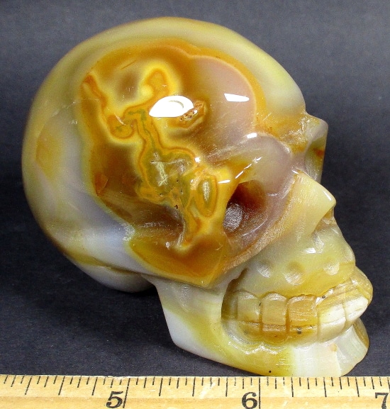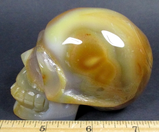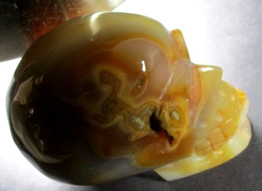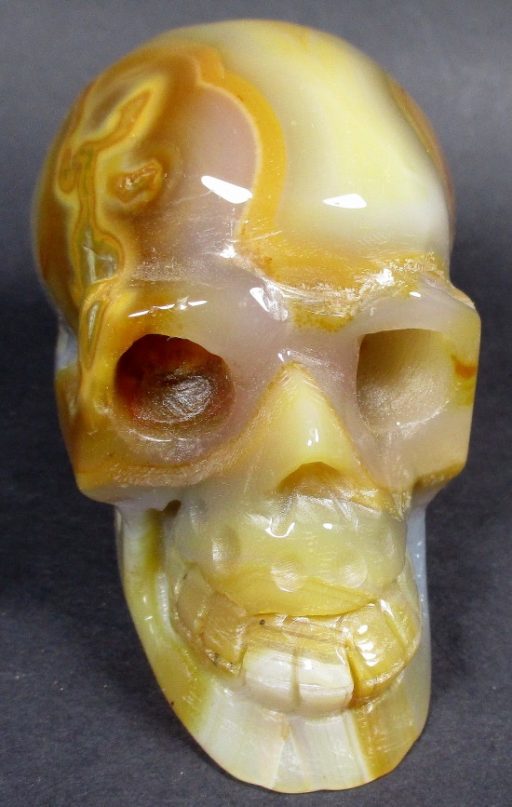 Here is something new to The Rock Shed!  An incredible Carnelian Agate Skull.  This highly detailed carving measures 3 1/8″ long x 1 7/8″ wide x 2 3/8″ tall. This beauty has a unique design and appearance in the different colors in the excellent banding in a captivating design.   Very cool!
