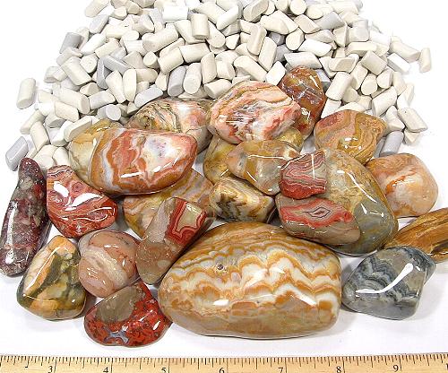 This is a batch of Local Prairie Agate, and TP Canyon Agate that we did in our Lot O Tumbler. Note the Ceramic Media we used in the background. The agates were pre-shaped in a lortone QT12 and then transferred to the Lot O Tumbler. We ran them 36 hours in our 500F Aluminum Oxide Pre Polish, washed them and ran 24 hours in our Aluminum Oxide Polish. Total weight including the media of the finished batch was approximately 4.2 lbs.