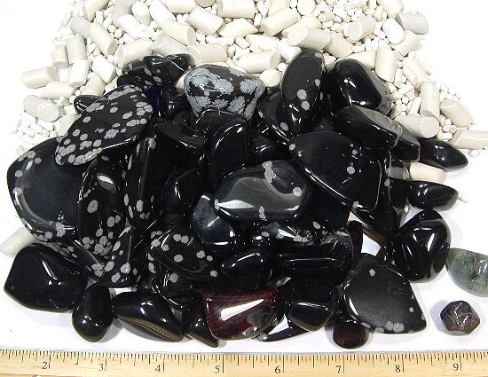 This is a batch of Snow Flake Obsidian, Apache Tear Mix that we did in our Lot O Tumbler. Note the Ceramic Media we used in the background. We ran them in 120-220 Grit until they were pleasantly shaped. Approximately a week, rinsing and adding fresh grit every 24 hours. We ran them 36 hours in our 500F Aluminum Oxide Pre Polish, 30 hours in 1000 Grit Aluminum Oxide pre-polish, and 24 hours in our Aluminum Oxide Polish. Note the stray garnet and Labradorite to the right which also polished well. Total weight including the media of the finish batch was approximately 3.75 lbs.
