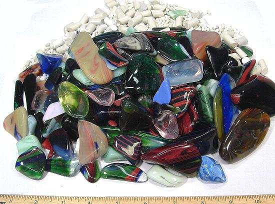This is a batch of glass that we did in our Thumlers UV10 Vibrating Tumbler. Note the Ceramic Media we used in the background. This glass was pre-shaped in a larger tumbler with 60-90 grit. We sorted the larger batch and transferred the nicely shaped pieces to the UV-10 and ran them in 120-220 Grit for about 36 hours. We ran them 36 hours in our 500F Aluminum Oxide Pre Polish, 30 hours in 1000 Grit Aluminum Oxide pre-polish, and 24 hours in our Aluminum Oxide Polish. Total weight including the media of the finished batch was approximately 8.5 lbs.